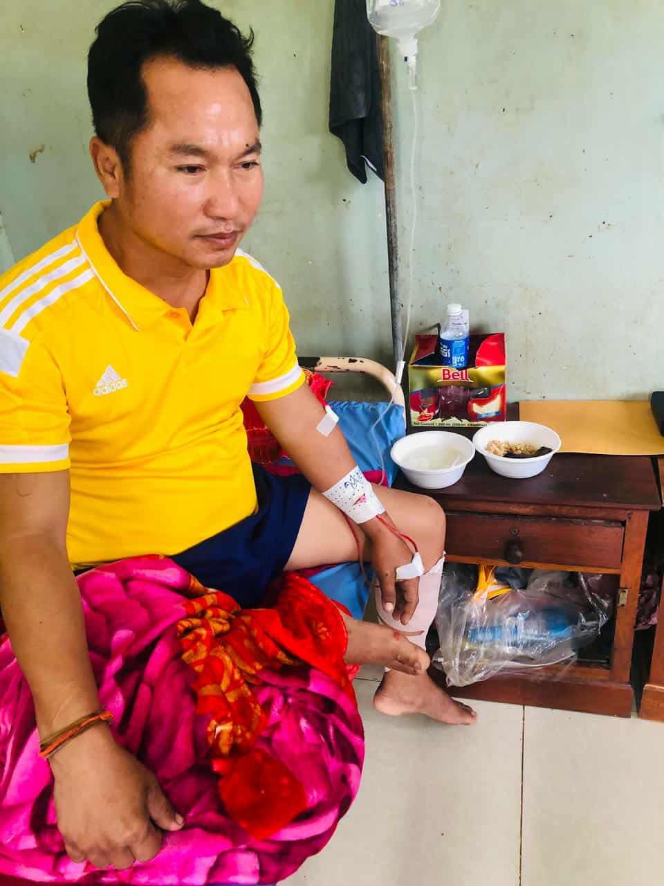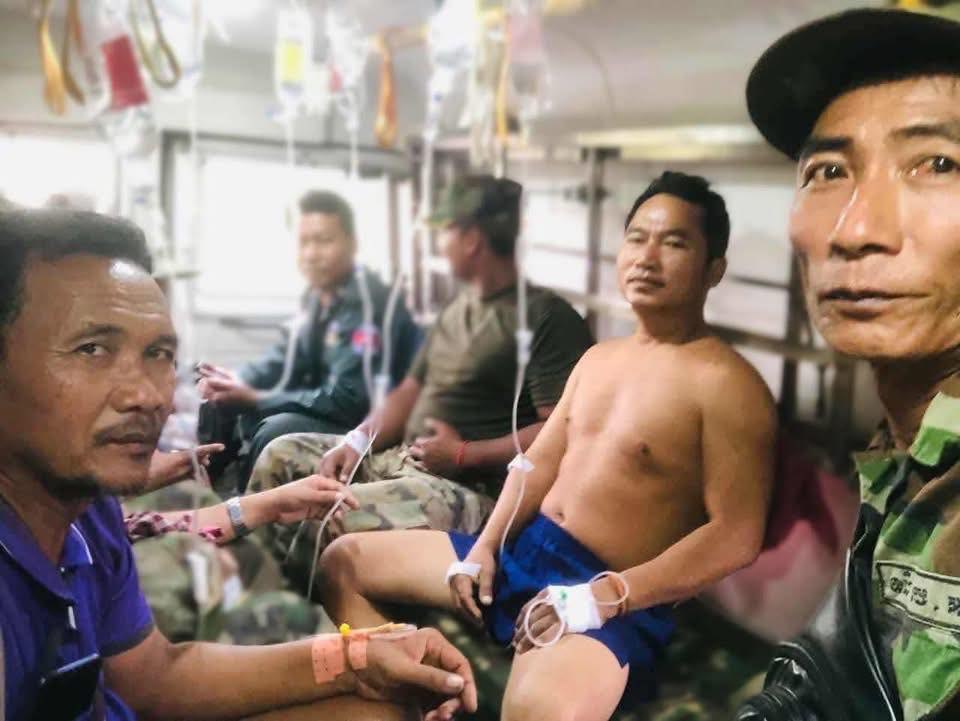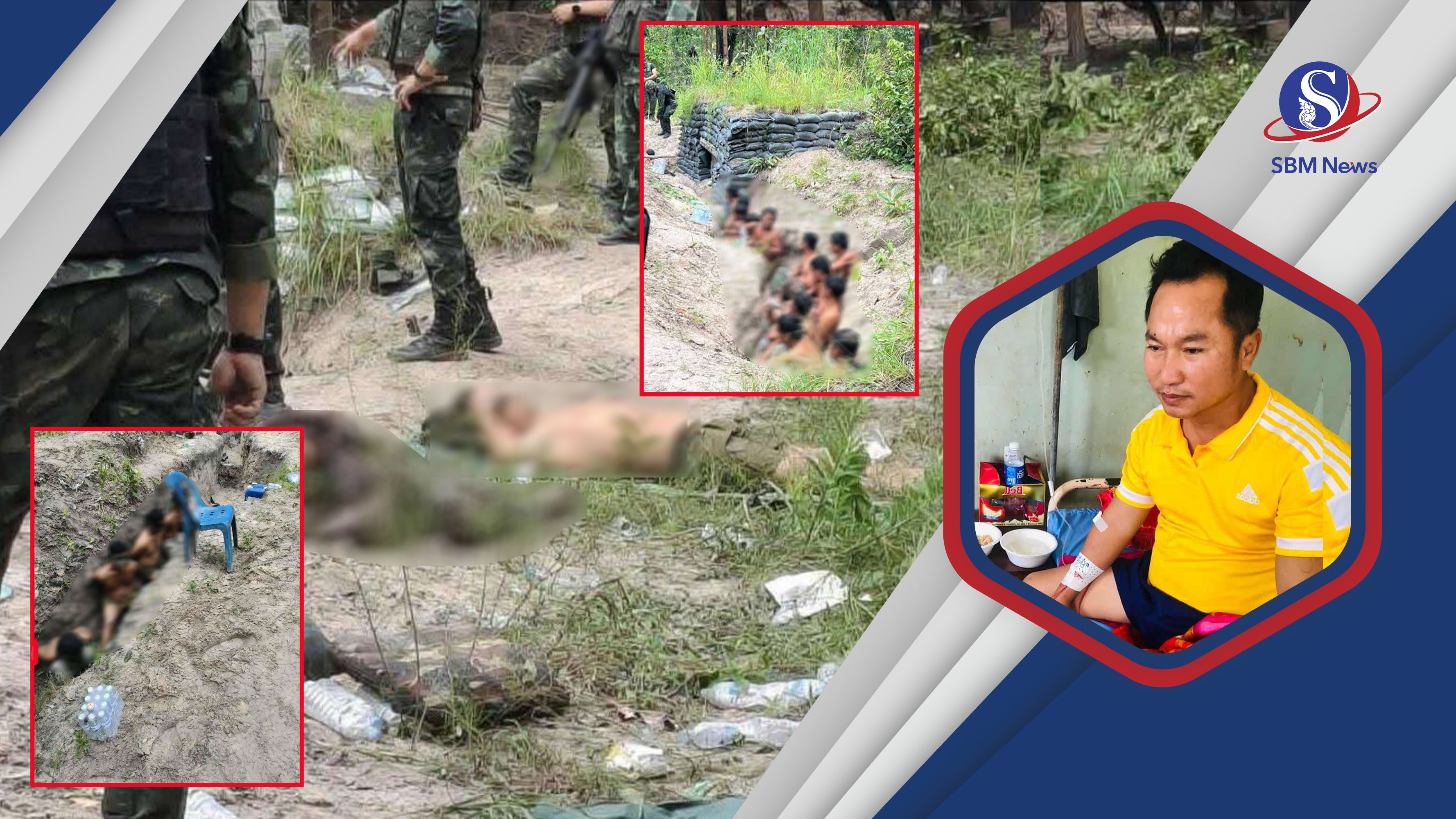 Mr. Pech Sopha, called Sok, a Cambodian soldier who escaped from death, is currently receiving treatment at Health Center, Chaeb District. He confirmed to SBM News via telephone that the leaked images on social media since yesterday, July 29, showing two Cambodian soldiers lying dead on the ground near invading Thailand's soldiers were the real images of himself. He was extremely fortunate, after being wounded and pretended to be dead and managed to secretly escape.