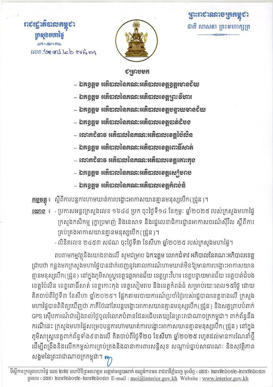 ការបន្តហាមឃាត់បង្ហោះដ្រូន ក្នុងខេត្តទាំង៩ ត្រូវបានលោក ស សុខា បញ្ជាក់ថា ដោយសារតែភាគីថៃនៅតែបន្តបង្ហោះអាកាសយានគ្មានមនុស្សបើក (ដ្រូន) និងសត្វព្រាបបំពាក់ GPS ស៊ើបការណ៍ជារៀងរាល់ថ្ងៃចូលរំលោភបំពានដែនអធិបតេយ្យនៃព្រះរាជាណាចក្រកម្ពុជា។ ដូច្នេះ ដើម្បីពង្រឹង និងលើកកម្ពស់ការគ្រប់គ្រង និងធានាការពារសន្តិសុខ សណ្តាប់ធ្នាប់សាធារណៈ និងសុវត្ថិភាពសង្គមក្នុងប្រទេសកម្ពុជា ក្រសួងមហាផ្ទៃ សម្រេចបន្តការហាមឃាត់ការបង្ហោះអាកាសយានគ្មានមនុស្សបើក (ដ្រូន) នៅក្នុងភូមិសាស្ត្រខេត្តពាក់ព័ន្ធទាំង៩ រួមមាន៖ ខេត្តឧត្ដរមានជ័យ ព្រះវិហារ បន្ទាយមានជ័យ បាត់ដំបង ប៉ៃលិន ពោធិ៍សាត់ កោះកុង សៀមរាប និងកំពង់ធំ។ ខេត្តទាំង៩ នឹងមិនអនុញ្ញាតឱ្យបង្ហោះដ្រូនជាដាច់ខាត ចាប់ពីចាប់ពីថ្ងៃទី២០សីហា ឆ្នាំ២០២៥ រហូតដល់មានការណែនាំថ្មី។