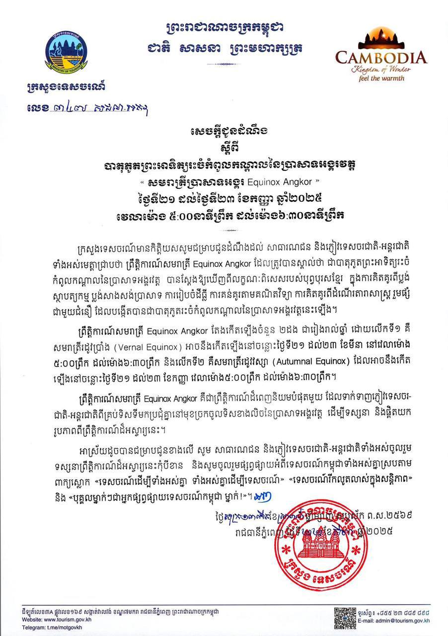 ខេត្តសៀមរាប៖ ព្រឹត្តិការណ៍ដ៏អស្ចារ្យព្រះអាទិត្យរះចំកំពូលប្រាសាទអង្គរវត្ត ដែលហៅថា «សមរាត្រីប្រាសាទអង្គរ ឬ Equinox Angkor» នឹងកើតមានឡើងរយៈពេល៣ថ្ងៃជាប់ៗគ្នាដូចរាល់ដង ចាប់ពីថ្ងៃទី២១ រហូតដល់ថ្ងៃទី២៣កញ្ញា ឆ្នាំ២០២៥។ នេះបើតាមសេចក្តីជូនដំណឹងរបស់ក្រសួងទេសចរណ៍ នៅថ្ងៃទី២៣សីហា។