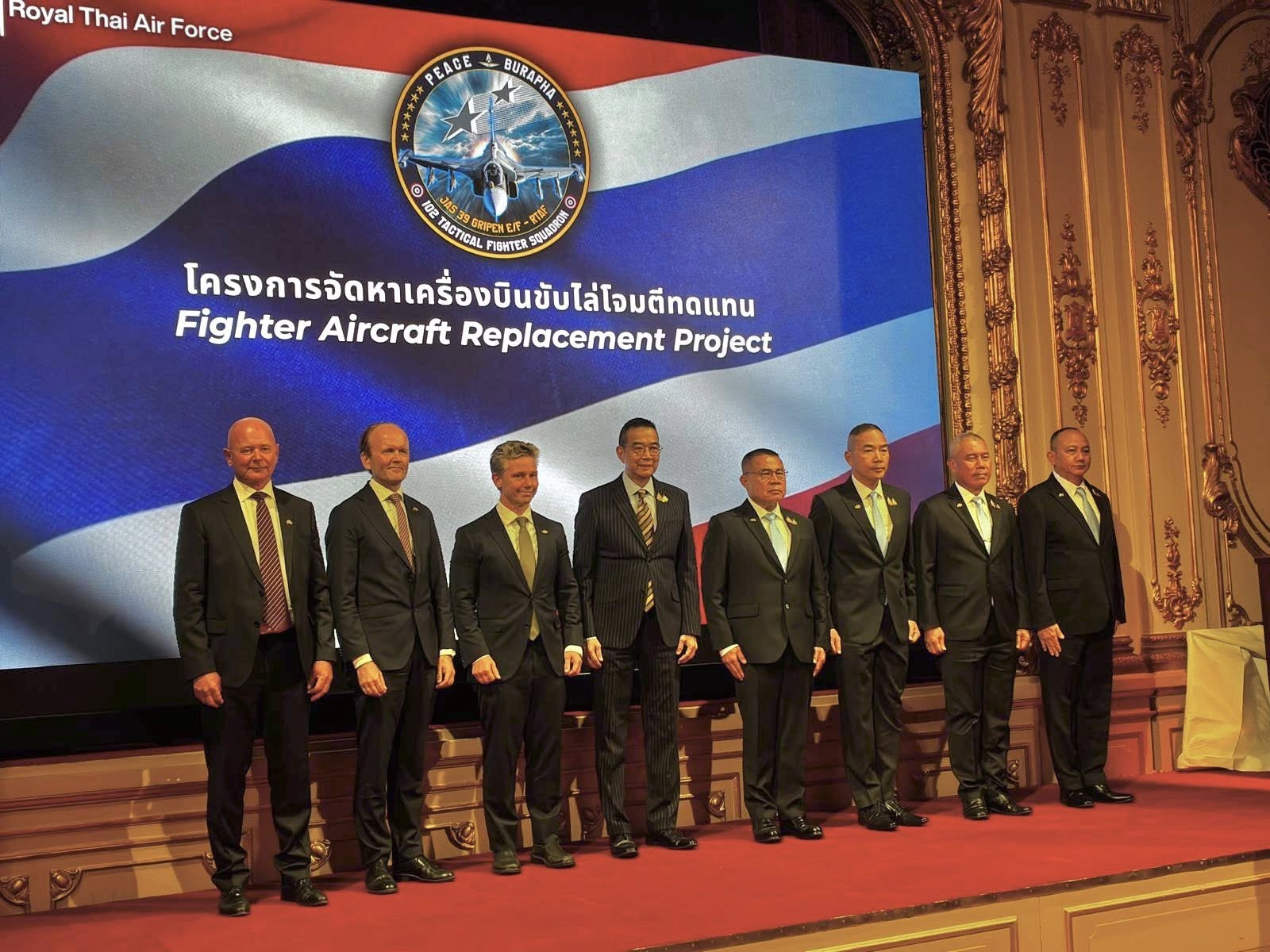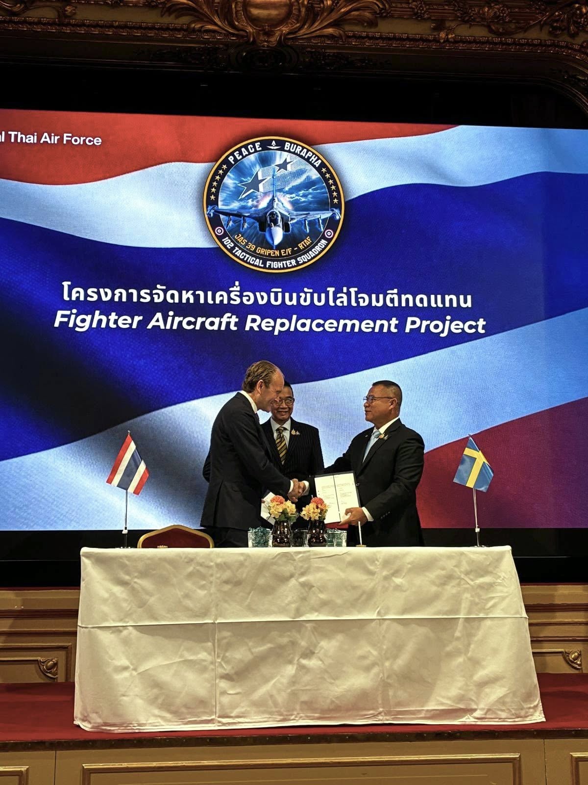 ការចុះហត្ថលេខាដំណាក់កាលទី១ នៃលទ្ធកម្មយន្តហោះចំនួន៤គ្រឿងក្នុងចំណោមយន្តហោះ១២គ្រឿង ដើម្បីជំនួសយន្តហោះ F-16 ដែលមានអាយុកាលជាង៣៧ ឆ្នាំមកហើយ។ រដ្ឋមន្ត្រីការបរទេសថៃ លោក ម៉ារីស ស្ងៀមពង្ស បានសង្កត់ធ្ងន់ថា កិច្ចព្រមព្រៀងនេះ មិនត្រឹមតែពង្រឹងក្រញ៉ាំបក្សីស្លាបដែករបស់កងទ័ពអាកាសថៃប៉ុណ្ណោះទេ ប៉ុន្តែថែមទាំងតំណាងឱ្យព្រឹត្តិការណ៍ដ៏សំខាន់មួយ ក្នុងការជំរុញឧស្សាហកម្មការពារជាតិរបស់ថៃ ក្រោមគោលនយោបាយរបស់រាជរដ្ឋាភិបាល។ លោកបន្ថែមថា៖«កិច្ចព្រមព្រៀងនេះ ក៏បានធានាដល់ប្រទេសស៊ុយអែត និងសហគមន៍អន្តរជាតិផងដែរ បន្ទាប់ពីមានការប៉ះទង្គិចគ្នានៅតាមបណ្តោយព្រំដែនកម្ពុជា-ថៃ។ យើងប្រើប្រាស់យន្តហោះ Gripen ក្នុងប្រតិបត្តិការយោធា ដើម្បីបង្ហាញយ៉ាងច្បាស់ថា យើងគ្មានចេតនាឈ្លានពានប្រឆាំងនឹងប្រទេសជិតខាងរបស់យើងទេ។ គោលបំណងយោធារបស់យើង ដែលធ្វើឡើងដោយភាពជាក់លាក់ បង្ហាញពិភពលោកថា ប្រទេសថៃគោរពយ៉ាងតឹងរឹងតាមច្បាប់អន្តរជាតិ»។ នេះគឺជាសម្តីផ្សេងពីចិត្តរបស់លោក ម៉ារីស ស្ងៀមពង្ស ដែលកំពុងប្រាប់ទៅសហគមន៍អន្តរជាតិ។