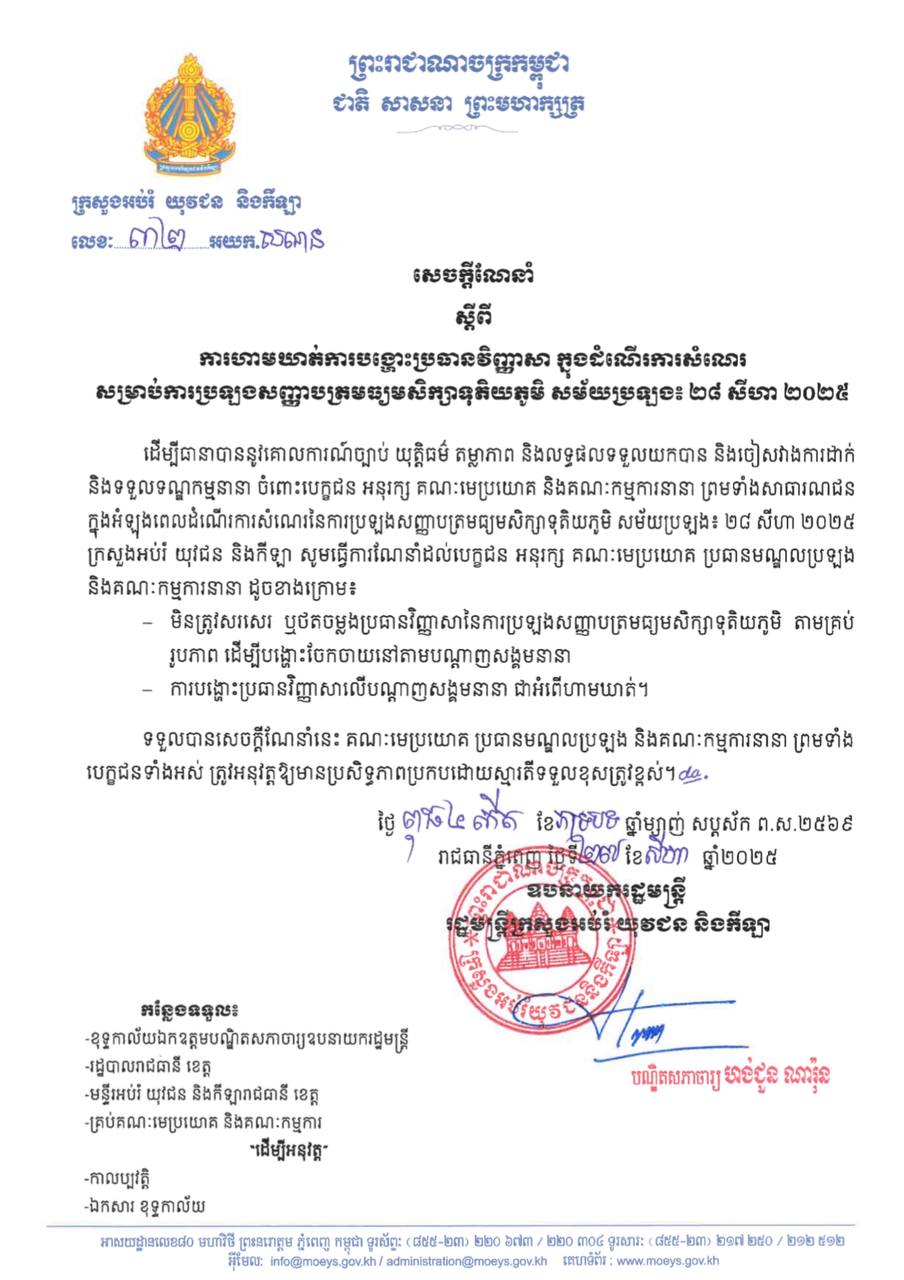 ក្រសួងលើកឡើងថា ដើម្បីធានាបាននូវគោលការណ៍ច្បាប់ យុត្តិធម៌ តម្លាភាព និងលទ្ធផលទទួលយកបាន និងចៀសវាងការដាក់ និងទទួលទណ្ឌកម្មនានាពីការប្រព្រឹត្តខុស។ ក្រសួងអប់រំ ណែនាំដល់បេក្ខជន អនុរក្ស គណៈមេប្រយោគ ប្រធានមណ្ឌលប្រឡង និងគណៈកម្មការនានា ព្រមទាំងសាធារណជនទាំងអស់ត្រូវជៀសវាងការលួយសរសេរ ឬថតចម្លងប្រធានវិញ្ញាសានៃការប្រឡងសញ្ញាបត្រមធ្យមសិក្សាទុតិយភូមិ តាមគ្រប់រូបភាព ដើម្បីបង្ហោះចែកចាយនៅតាមបណ្តាញសង្គមនានា។ ដោយក្រសួងចាត់ទុកថា នេះជាទង្វើល្ម់ើសច្បាប់។ ក្រសួងសង្កត់ធ្ងន់ថា៖«ការបង្ហោះប្រធានវិញ្ញាសាលើបណ្តាញសង្គមនានា ជាអំពើហាមឃាត់»។