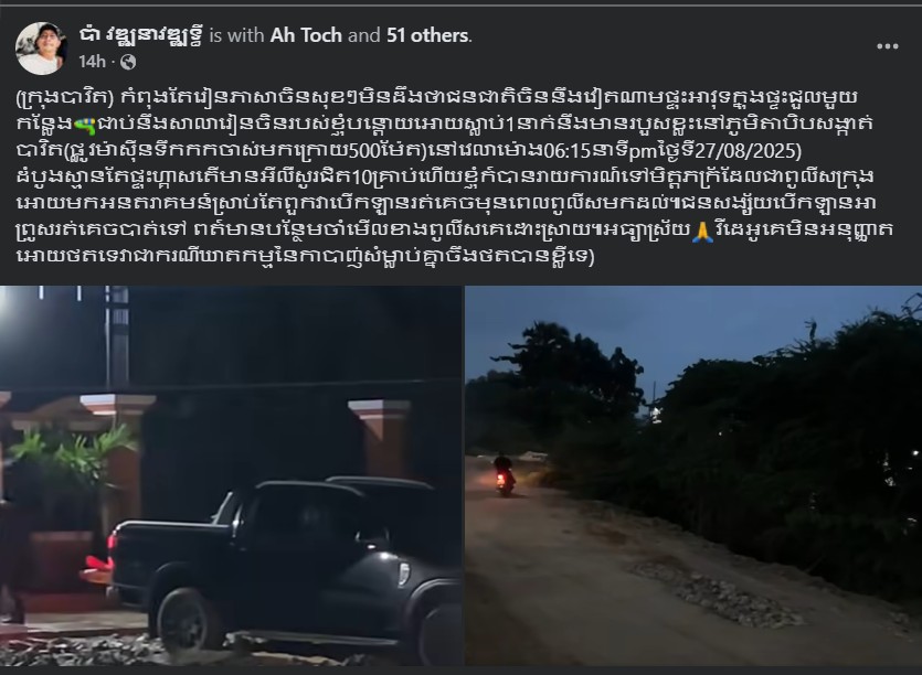 តាមរយៈគណនីហ្វេសប៊ុកឈ្មោះ ប៉ា វឌ្ឍនាវឌ្ឍទ្ធី បានបង្ហោះសំណេរភ្ជាប់ជាមួយរូបភាពដែលមានខ្លឹមសារថា កំពុងតែរៀនភាសាចិនសុខៗមិនដឹងថា ជនជាតិចិន ឬវៀតណាម ផ្ទុះអាវុធក្នុងផ្ទះនៅជួលមួយកន្លែងជិត១០គ្រាប់ បណ្ដាលឱ្យមានមនុស្សស្លាប់ និងរបួស ភ្លាមៗជនសង្ស័យ បានបើករថយន្តមួយគ្រឿងម៉ាក TOYOTA Prius រត់គេចចេញពីកន្លែងកើតហេតុបាត់ស្រមោលតែម្ដង។ ពលរដ្ឋខាងលើ បន្តថា បន្ទាប់ពីកើតហេតុរួច រូបគាត់បានទាក់ទងទៅកម្លាំងសមត្ថកិច្ចជំនាញនៃអធិការដ្ឋាននគរបាលក្រុងបាវិត ដើម្បីចុះមកអន្តរាគមន៍ និងធ្វើការត្រួតពិនិត្យទីតាំងខាងលើ ដើម្បីធ្វើការស្រាវវែកមុខរកខ្មាន់កាំភ្លើង យកផ្តន្ទាទោសតាមផ្លូវច្បាប់។