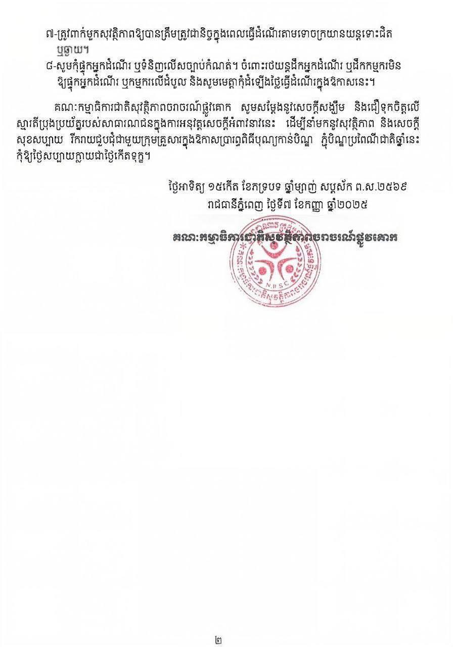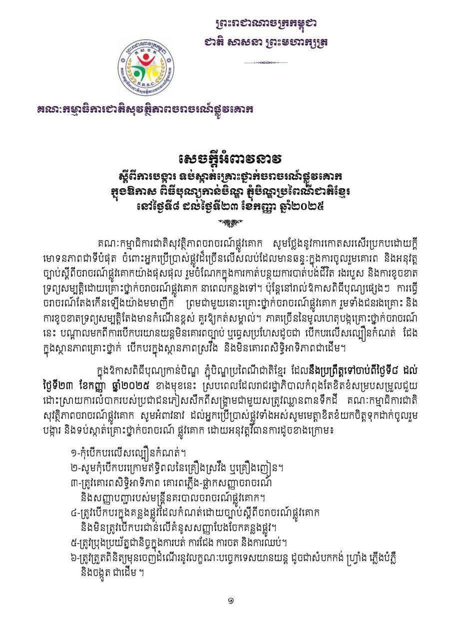 រាជធានីភ្នំពេញ៖ ក្នុងឱកាសពិធីបុណ្យកាន់បិណ្ឌភ្ជុំបិណ្ឌប្រពៃណីជាតិខ្មែរ នៅថ្ងៃទី៨ដល់ថ្ងៃទី២៣ ខែកញ្ញា ឆ្នាំ២០២៥ គណៈកម្មាធិការជាតិសុវត្ថិភាពចរាចរណ៍ផ្លូវគោក បានចេញសេចក្តីអំពាវនាវដល់ប្រជាពលរដ្ឋ៨ចំណុច ដើម្បីការបង្ការក៏ដូចជាទប់ស្កាត់គ្រោះថ្នាក់ចរាចរណ៍…។