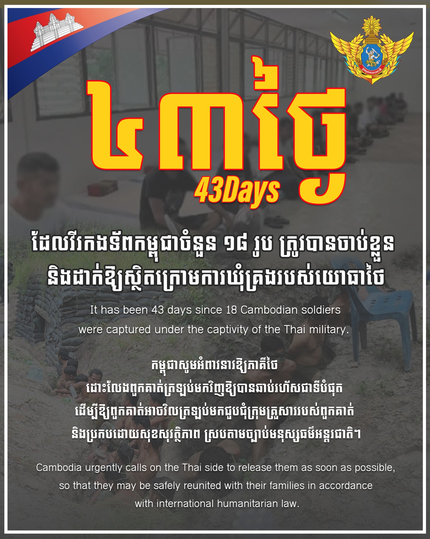 សូមជម្រាបថា គិតមកត្រឹមថ្ងៃទី១០កញ្ញា ឆ្នាំ២០២៥នេះ គឺមានរយៈពេល៤៣ថ្ងៃហើយ ដែលវីរកងទ័ពកម្ពុជា១៨រូប ត្រូវបានចាប់ខ្លួន និងដាក់ឱ្យស្ថិតក្រោមការឃុំគ្រងរបស់យោធាថៃ។ ខណៈក្រសួងការពារជាតិកម្ពុជា នៅតែបន្តអំពាវនាវឱ្យភាគីថៃ ដោះលែងពួកគាត់ឱ្យត្រឡប់មកវិញឱ្យបានឆាប់រហ័សជាទីបំផុត និងប្រកបដោយសុខសុវត្ថិភាព ស្របតាមច្បាប់មនុស្សធម៌អន្តរជាតិ៕