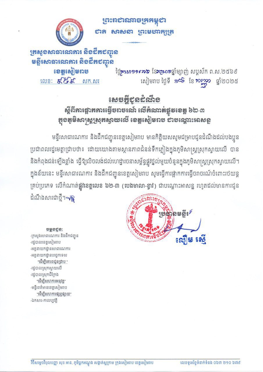 សូមជម្រាបថា សម្ពាធទាបដែលកើតនៅសមុទ្ទចិនខាងត្បូងបានវិវត្តទៅជាព្យុះទី១៧ឈ្មោះ «មីតាក» នឹងបោកបក់មកលើកកម្ពុជាតិចតួច ចាប់ពីថ្ងៃទី១៩ ដល់ថ្ងៃទី២១កញ្ញា បង្កឱ្យមានភ្លៀងធ្លាក់លាយទ្បំផ្គររន្ទះ និងខ្យល់កន្ត្រាក់គ្របដណ្ដប់លើផ្ទៃដី ពី៣០ទៅ៥០ភាគរយ។ នេះបើតាមការព្យាកររបស់ក្រសួងធនធានទឹក និងឧតុនិយម។ ស្ថិតក្នុងស្ថានភាពដ៏អាក្រក់នេះ មន្ទីរសាធារណការ និងដឹកជញ្ជូនខេត្តសៀមរាប កាលពីយប់ថ្ងៃ១៨កញ្ញា បានប្រកាសផ្អាកចរាចរណ៍ លើកំណាត់ផ្លូវខេត្ត ៦២-៣(បេងមាលា-ខ្វាវ) ក្នុងភូមិសាស្ត្រស្រុកស្វាយលើ ជាបណ្តោះអាសន្ន រហូតដល់មានការជូនដំណឹងសាជាថ្មី។ ការផ្អាកនេះ ធ្វើឡើងដោយសារស្ថានភាពជំនន់ទឹកភ្លៀងជន់ឡើងខ្លាំង ធ្វើឱ្យលិចលង់ដល់ហេដ្ឋារចនាសម្ព័ន្ធផ្លូវថ្នល់មួយចំនួនក្នុងតំបន់៕