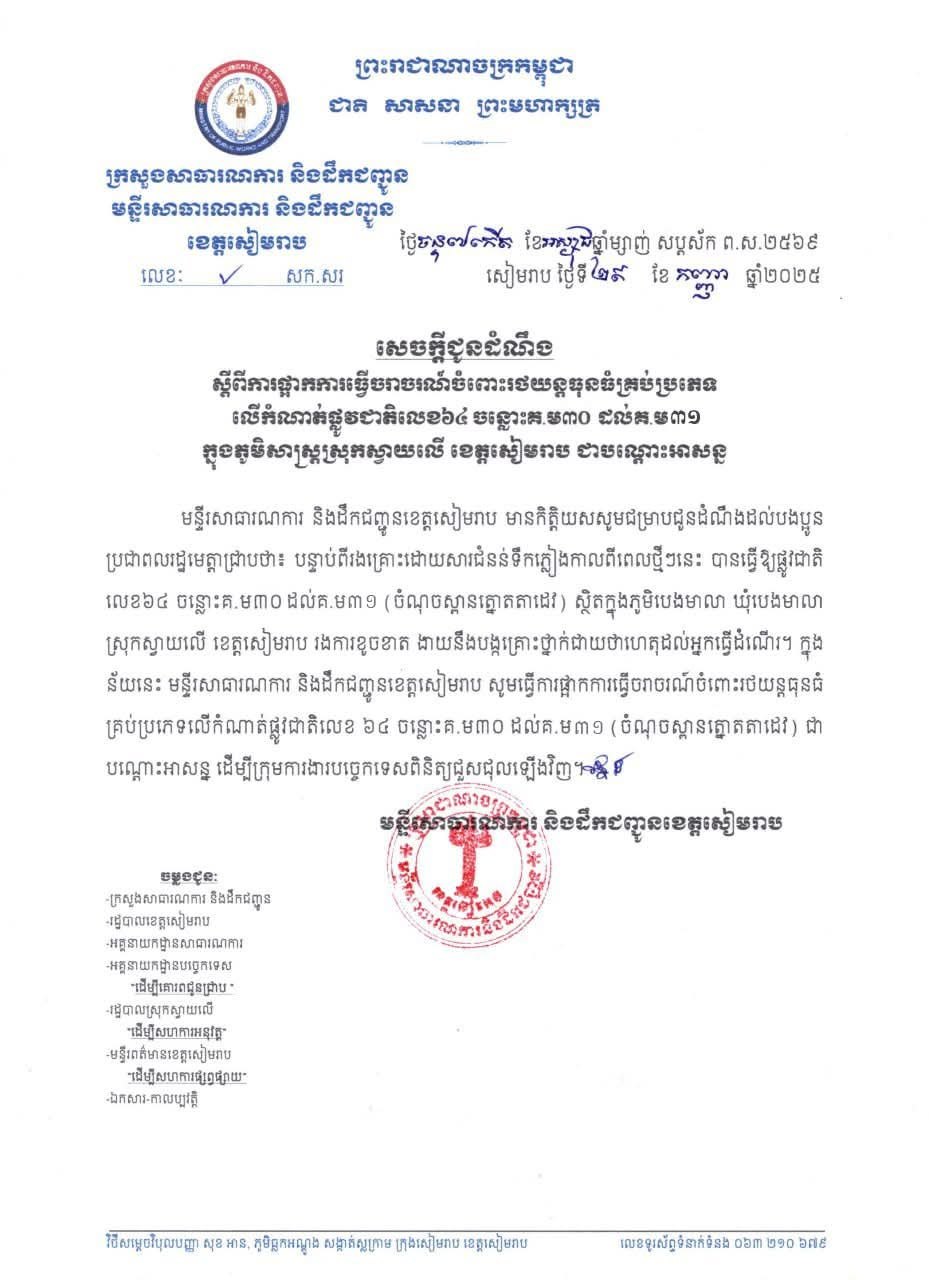 ក្រុងសៀមរាប៖ មន្ទីរសាធារណការ និងដឹកជញ្ជូនខេត្តសៀមរាប នៅល្ងាចថ្ងៃទី២៩កញ្ញា ឆ្នាំ២០២៥ បានប្រកាសបិទជាបណ្តោះអាសន្នចំពោះការធ្វើចរាចរណ៍រថយន្តធុនធំ លើកំណាត់ផ្លូវជាតិលេខ៦៤ ចន្លោះគីឡូម៉ែត្រ៣០ ដល់គីឡូម៉ែត្រ៣១ ក្នុងភូមិសាស្ត្រ ស្រុកស្វាយលើ។