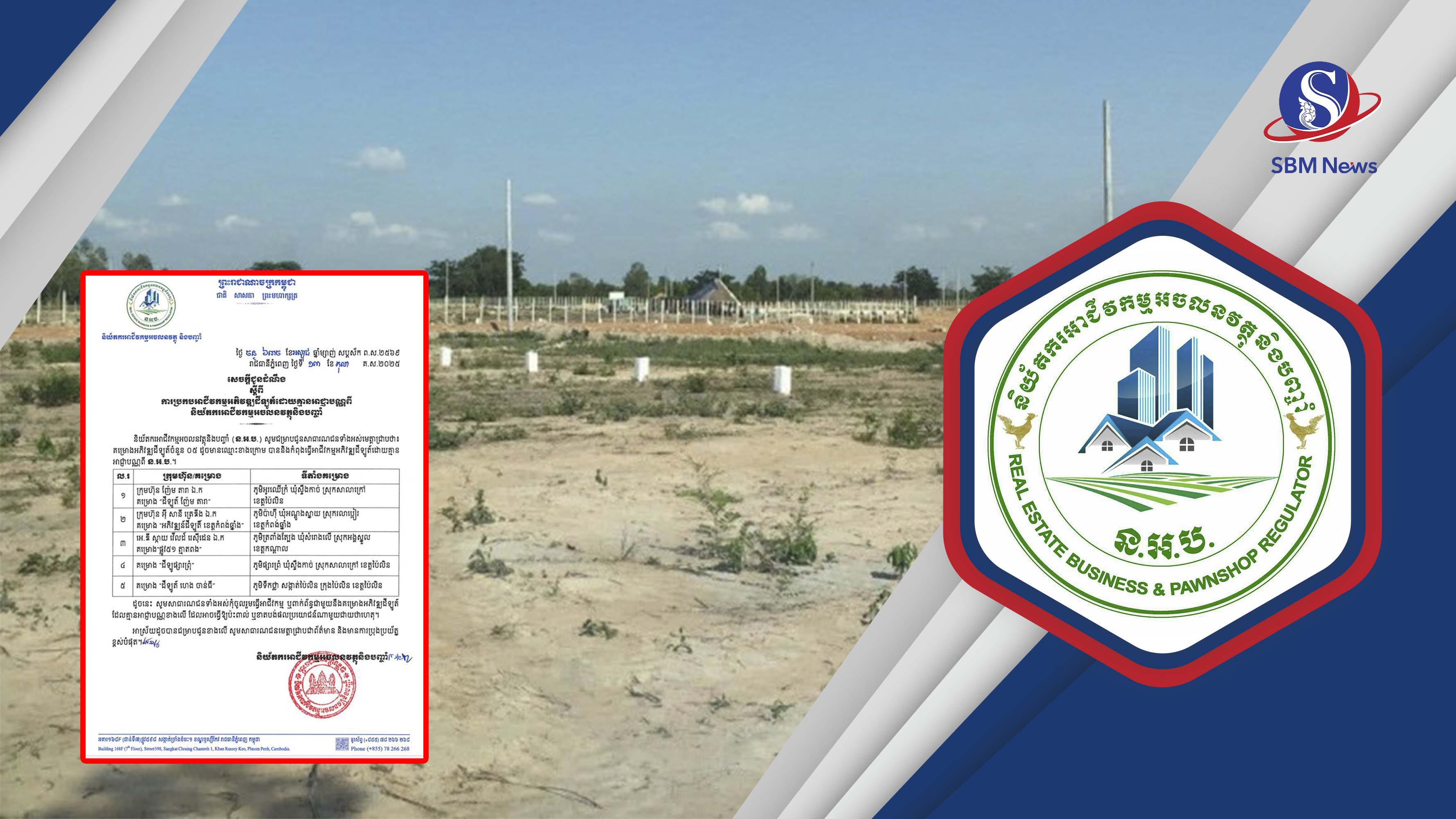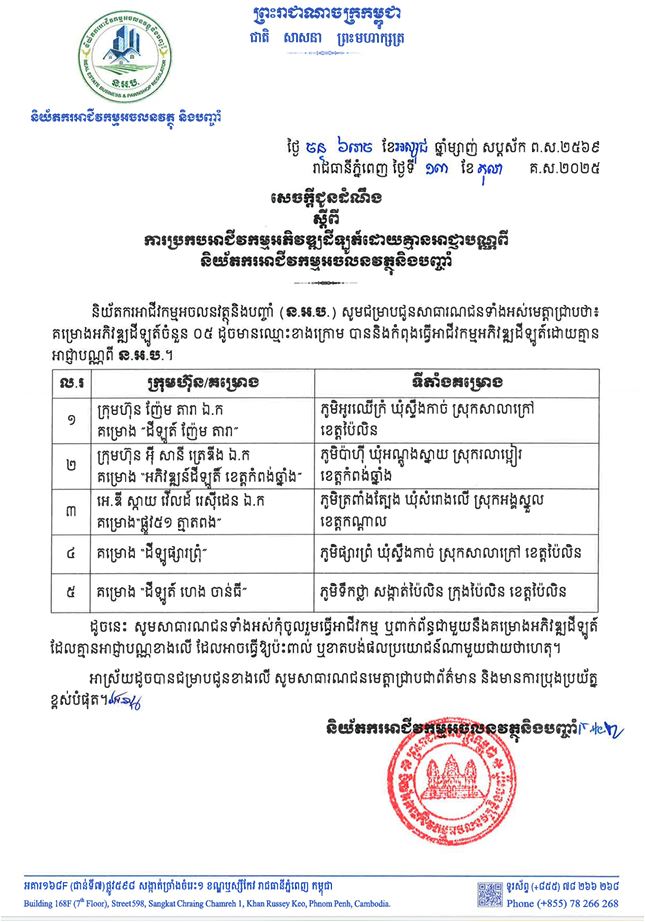 រាជធានីភ្នំពេញ៖ និយ័តករអាជីវកម្មអចលនវត្ថុ និងបញ្ចាំ (ន.អ.ប.) នៅថ្ងៃទី១៤ ខែតុលា ឆ្នាំ២០២៥ បានប្រកាសឱ្យសាធារណជនប្រុងប្រយ័ត្ន និងកុំពាក់ព័ន្ធជាមួយគម្រោងអភិវឌ្ឍដីឡូតិ៍ចំនួន៥ ស្ថិតនៅខេត្តកណ្តាល កំពង់ឆ្នាំង និងខេត្តប៉ៃលិន ដែល ន.អ.ប. រកឃើញថា គ្មានអាជ្ញាបណ្ណ..។