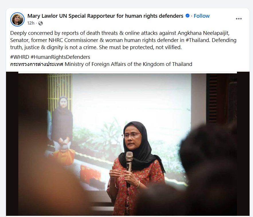 ជាក់ស្តែង អ្នករាយការណ៍ពិសេសរបស់អង្គការសហប្រជាជាតិ ទទួលបន្ទុកសិទ្ធិមនុស្ស លោកស្រី ម៉ារី ឡាវឡ័រ (Mary Lawlor) បានសរសេររៀបរាប់លើបណ្តាញសង្គមហ្វេសប៊ុក កាលពីថ្ងៃទី១៥តុលាថា ៖«[ខ្ញុំ]មានការព្រួយបារម្ភយ៉ាងខ្លាំង ចំពោះរបាយការណ៍នៃការគំរាមសម្លាប់ និងការវាយប្រហារតាមអ៊ីនធឺណិតប្រឆាំងនឹង លោកស្រី អង្គាណា នីឡាផៃជីត ដែលជាព្រឹទ្ធសមាជិក អតីតគណកម្មាធិការសិទ្ធិមនុស្សជាតិ (NHRC) និងស្ត្រីអ្នកការពារសិទ្ធិមនុស្សនៅប្រទេសថៃ»។ លើសពីនេះ លោកស្រីបានបន្ថែមថា៖«ការការពារការពិត យុត្តិធម៌ និងសេចក្តីថ្លៃថ្នូរ មិនមែនជាឧក្រិដ្ឋកម្មទេ។ លោកស្រីត្រូវតែត្រូវបានការពារ និងមិនត្រូវប្រមាថឡើយ»។