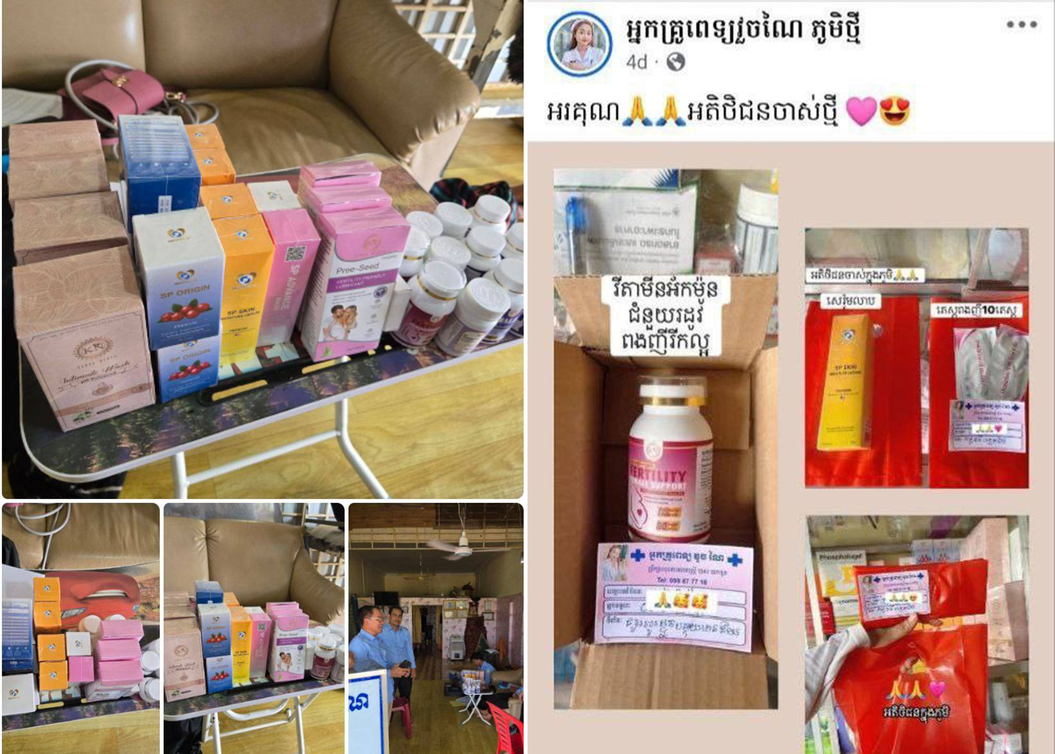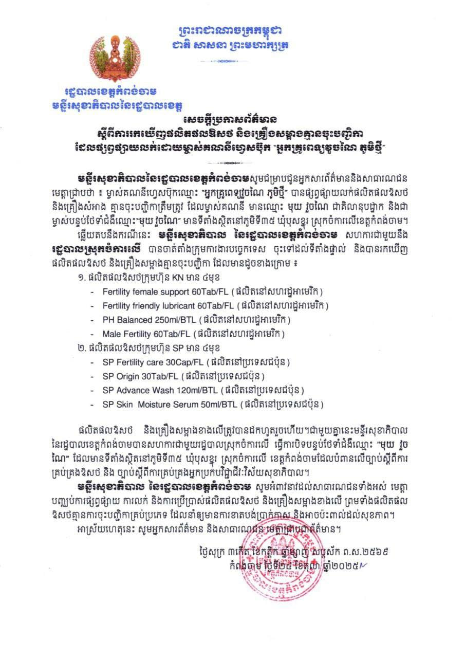 មន្ទីរសុខាភិបាលខេត្តកំពង់ចាម បានសហការជាមួយនឹង រដ្ឋបាលស្រុកចំការលើ បានចាត់តាំងក្រុមការងារបច្ចេកទេស ចុះទៅដល់ទីតាំងផ្ទាល់របស់ម្ចាស់គណនីហ្វេសប៊ុក ឈ្មោះ មុយ វួចណៃ ជាគិលានុបដ្ឋាក និងជាម្ចាស់បន្ទប់ថែទាំជំងឺ «ឈ្មោះ មុយ រួចណៃ» ស្ថិតនៅភូមិទី៣៥ ឃុំបូសខ្នុរ ស្រុកចំការលើខេត្តកំពង់ចាម។ ក្រោយចុះត្រួតពិនិត្យ មន្ទីរបានរកឃើញ មានដាក់លក់ផលិតផលឱសថក្រុមហ៊ុន KN ចំនួន៤មុខ និងផលិតផលឱសថក្រុមហ៊ុន SP ចំនួន៤មុខ ដោយមិនបានចុះបញ្ជីកាត្រឹមត្រូវ។