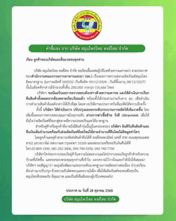ក្រុមហ៊ុន Hong Thai Herbal បានលើកឡើងនៅក្នុងសេចក្ដីថ្លែងការណ៍មួយនៅលើគេហទំព័រហ្វេសប៊ុកថា ៖«ក្រុមហ៊ុនទទួលស្គាល់យ៉ាងពេញលេញ និងទទួលយកលទ្ធផលនៃការត្រួតពិនិត្យរបស់រដ្ឋបាលចំណីអាហារ និងឱសថរបស់ប្រទេសថៃដោយក្ដីគោរពបំផុត។ យើងបានប្រមូលមកវិញនូវផលិតផលដែលរងផលប៉ះពាល់ទាំងអស់ពីទីផ្សាររួចហើយ ហើយកំពុងសម្របសម្រួលជាមួយរដ្ឋបាលចំណីអាហារ និងឱសថដើម្បីបន្តការប្រមូលមកវិញឱ្យបានឆាប់តាមដែលអាចធ្វើទៅបាន។ កាលបរិច្ឆេទពិតប្រាកដនៃផលប៉ះពាល់នឹងត្រូវប្រកាសជាផ្លូវការនៅពេលក្រោយ»។ ក្រុមហ៊ុននេះបានបន្ថែមទៀតថា ៖«ខ្លួនបានពង្រឹង និងធ្វើឱ្យប្រសើរឡើងនូវដំណើរការផលិតរបស់ខ្លួន និងបានបន្ថែមវិធានការត្រួតពិនិត្យគុណភាពបន្ថែមទៀតនៅគ្រប់ដំណាក់កាល ដើម្បីធានាថាផលិតផលទាំងអស់ដែលចេញលក់នៅលើទីផ្សារនាពេលខាងមុខមានសុវត្ថិភាព អនាម័យ និងអនុលោមតាមស្ដង់ដារសុខភាព។ យើងសូមអភ័យទោសដោយស្មោះចំពោះដៃគូរបស់យើងសម្រាប់ការរអាក់រអួលណាមួយ និងអតិថិជនដ៏មានតម្លៃរបស់យើងចំពោះការព្រួយបារម្ភណាមួយដែលបង្កឡើង។ យើងសូមថ្លែងអំណរគុណយ៉ាងជ្រាលជ្រៅចំពោះការយល់ដឹង ការជឿទុកចិត្ត និងការគាំទ្ររបស់អ្នកជាបន្ត»។