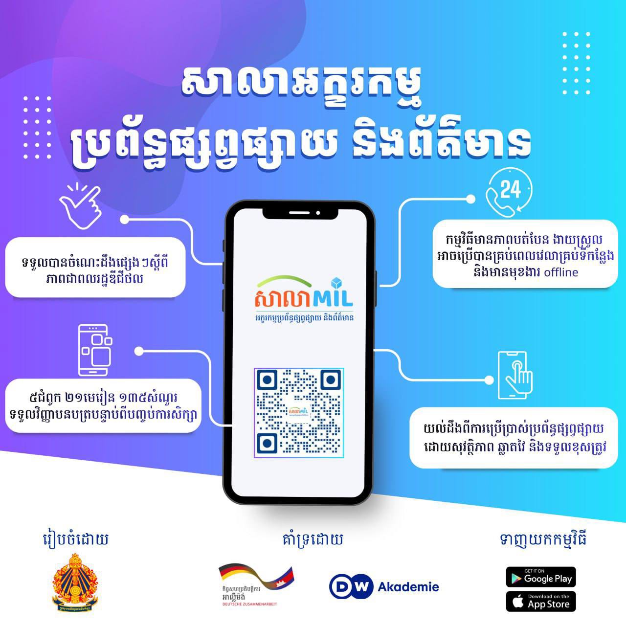 ពិធីសម្ពោធដាក់ឱ្យប្រើប្រាស់ជាផ្លូវការ កម្មវិធីទូរសព្ទដៃ «សាលាអក្ខរកម្មប្រព័ន្ធផ្សព្វផ្សាយ និងព័ត៌មាន» បានធ្វើឡើងក្រោមវត្តមានលោកស្រី គឹម សេដ្ឋានី រដ្ឋលេខាធិការប្រចាំការក្រសួងអប់រំ លោកស្រី ណាឌីនណេ ជូរ៉ាត់ Nadine Jurrat អនុប្រធាននាយកដ្ឋាន DW Akademie ប្រចាំតំបន់អាស៊ី និងអឺរ៉ុប និងមន្រ្តីពាក់ព័ន្ធជាច្រើនរូបទៀត កាលពីរសៀលថ្ងៃទី១៣វិច្ឆិកា ឆ្នាំ២០២៥។ កម្មវិធីទូរសព្ទដៃ «អក្ខរកម្មប្រព័ន្ធផ្សព្វផ្សាយ និងព័ត៌មាន» មានមាតិកាច្រើនសម្បូរបែប ដោយមានមេរៀន សំណួរចម្លើយ រូបភាព វីដេអូ បណ្ណាល័យ តំណភ្ជាប់ទៅកាន់កម្មវិធីផ្ញើសារស្វ័យប្រវត្តិតាមតេឡេក្រាម ព្រមទាំងមានមុខងារតាមដានវឌ្ឍនភាពការសិក្សា មុខងាររក្សាទុក ក្រុមពិភាក្សា និងការវាយតម្លៃទៅលើមេរៀននីមួយៗ។ កម្មវិធីនេះមានភាពបត់បែន និងងាយស្រួល ដែលអាចឱ្យអ្នកប្រើប្រាស់ស្រាវជ្រាវ ស្វ័យសិក្សាដោយខ្លួនឯងគ្រប់ពេលវេលា និងគ្រប់ទីកន្លែង។