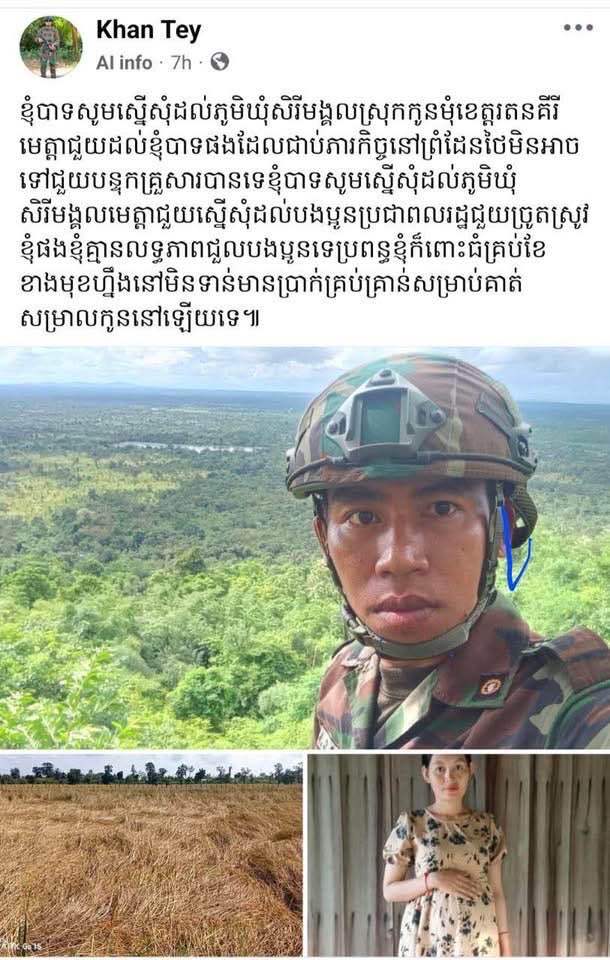 ក្រុងបានលុង៖ ស្នងការនគរបាលខេត្តរតនគិរី លោកឧត្តមសេនីយ៍ទោ អ៊ុង សុភាព នៅរសៀលថ្ងៃទី២០វិច្ឆិកា ឆ្នាំ២០២៥នេះ បានចេញបញ្ជាដល់កម្លាំងនគរបាលឱ្យចុះជួយច្រូតស្រូវដល់គ្រួសារយោធាកម្ពុជាមួយរូប រស់នៅក្នុងស្រុកកូនមុំ ដែលកំពុងជាប់បំពេញភារកិច្ចការពារព្រំដែនកម្ពុជា-ថៃ ចំពេលភរិយារបស់យោធាកម្ពុជារូបនោះមានផ្ទៃពោះ ជិតនឹងសម្រាលកូន…។