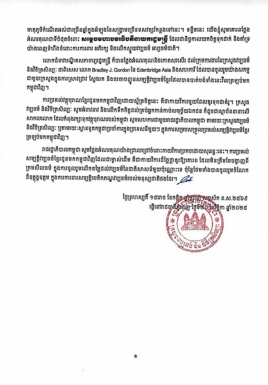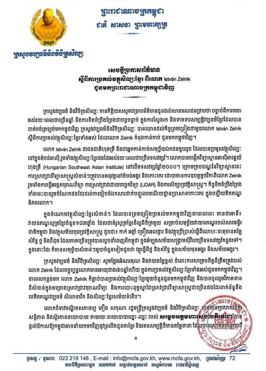 មន្រ្តីវប្បធម៌ គូសបញ្ជាក់ថា ក្រោយការចរចាអស់រយៈពេលជាច្រើនឆ្នាំ ក្នុងការទាមទារសម្បត្តិវប្បធម៌ខ្មែរដែលបានបាត់បង់ត្រឡប់មកវិញ ជាលទ្ធផល លោក István Zelnik ជនជាតិហុងគ្រី អ្នកកាន់កាប់សមុច្ច័យឯកជនមួយរូប ដែលបានប្រមូលវត្ថុសិល្បៈនៅក្នុងតំបន់អាស៊ី រួមទាំងវត្ថុសិល្បៈខ្មែរ បានធ្វើកិច្ចព្រមព្រៀងជាមួយក្រសួងវប្បធម៌ និងវិចិត្រសិល្បៈកម្ពុជា ប្រគល់រតនវត្ថុសិល្បៈខ្មែរមកវិញ។ មន្រ្តីវប្បធម៌ថ្លែងអំណរគុណ និងវាយតម្លៃខ្ពស់ ចំពោះការសម្រេចចិត្តដ៏ត្រឹមត្រូវរបស់លោក István Zelnik ដោយការប្រគល់វត្ថុបុរាណខ្មែរដោយស្ម័គ្រចិត្តនេះ គឺជាកាយវិការមួយដែលគួរទុកជាគំរូ។