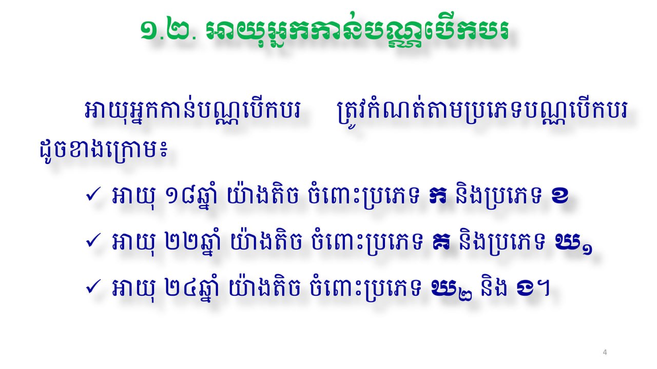 រាជធានីភ្នំពេញ៖ យោងតាមច្បាប់កម្ពុជា អាយុអ្នកកាន់បណ្ណបើកបររថយន្ត, ទោចក្រយានយន្ត, ត្រីចក្រយានយន្ត, ត្រូវបានកំណត់ដោយច្បាប់ និងតាមប្រភេទបណ្ណបើកបរ ដោយរាប់ចាប់ពីអាយុ១៨ឆ្នាំយ៉ាងតិច។ ខាងក្រោមនេះ គឺជាប្រភេទបណ្ណបើកបរ និងអាយុអ្នកមានសិទ្ធិកាន់បណ្ណ ដោយរាប់ចាប់ពីប្រភេទ «ក» ដល់ «ង»..។