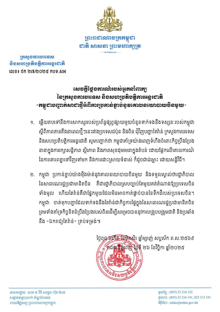 អ្នកនាំពាក្យក្រសួងការបរទេស បានចេញសេចក្ដីថ្លែងការណ៍នៅយប់ថ្ងៃទី២៦ ខែវិច្ឆិកា ឆ្នាំ២០២៥ថា កម្ពុជាគាំទ្រយ៉ាងពេញទំហឹងចំពោះកិច្ចប្រឹងប្រែងនានាក្នុងការរក្សាសន្តិភាព ស្ថិរភាព និងភាពសុខដុមរមនាក្នុងតំបន់ ដោយផ្អែកលើគោលការណ៍នៃការគោរពគ្នាទៅវិញទៅមក និងការដោះស្រាយទំនាស់ ក៏ដូចជាជម្លោះដោយសន្តិវិធី។ «កម្ពុជាប្រកាន់ខ្ជាប់យ៉ាងម៉ឺងម៉ាត់នូវគោលនយោបាយចិន[តែ]មួយ និងទទួលស្គាល់ថា រដ្ឋាភិបាលនៃសាធារណរដ្ឋប្រជាមានិតចិន គឺជារដ្ឋាភិបាលស្របច្បាប់តែមួយគត់តំណាងឱ្យប្រទេសចិនទាំងមូល ហើយតៃវ៉ាន់ គឺជាផ្នែកមួយដែលមិនអាចកាត់ផ្តាច់បាននៃទឹកដីរបស់ប្រទេសចិន»។