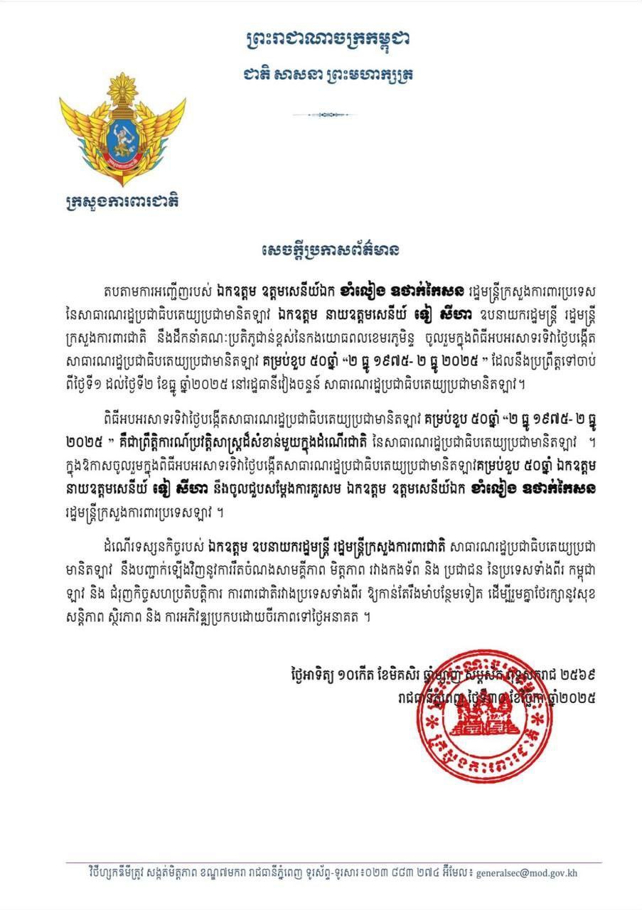 ដំណើរអញ្ជើញចូលរួមអបអរសាទរខួប៥០ឆ្នាំ ថ្ងៃបង្កើតសាធារណរដ្ឋប្រជាធិបតេយ្យប្រជាមានិតឡាវ «២ធ្នូ ១៩៧៥-២ធ្នូ ២០២៥» ពីសំណាក់រដ្ឋមន្រ្តីក្រសួងការពារជាតិកម្ពុជា ធ្វើឡើងតបតាមការអញ្ជើញរបស់លោក ខាំលៀង ឧថាក់កៃសន រដ្ឋមន្ត្រីក្រសួងការពារប្រទេស នៃសាធារណរដ្ឋប្រជាធិបតេយ្យប្រជាមានិតឡាវ។ ពិធីនេះ នឹងប្រព្រឹត្តទៅរយៈពេល២ថ្ងៃ ចាប់ពីថ្ងៃទី១-២ ខែធ្នូ ឆ្នាំ២០២៥។