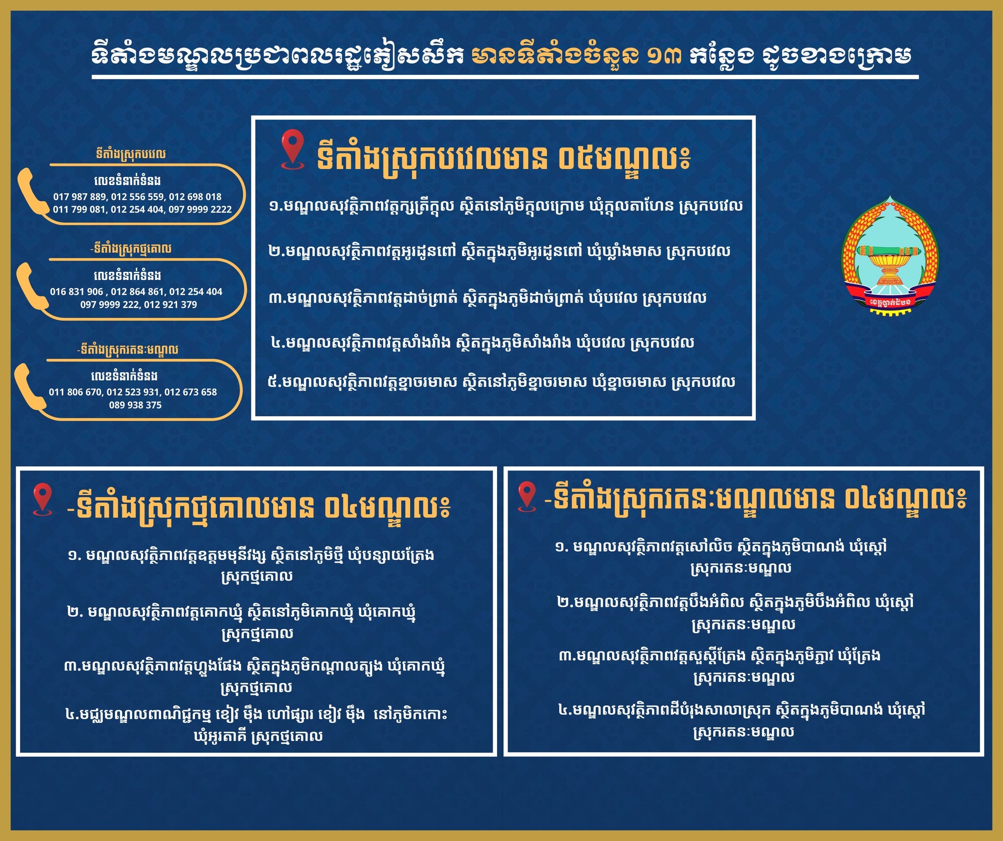 រដ្ឋបាលខេត្តបាត់ដំបង បានឱ្យដឹងថា ទីតាំងមណ្ឌលប្រជាពលរដ្ឋភៀសសឹកទាំង១៣កន្លែងនោះរួមមាន៖ ទីតាំង ស្រុកបវេល មាន៥មណ្ឌលដូចជា៖ មណ្ឌលសុវត្ថិភាពវត្តក្សត្រីក្ដុល ស្ថិតនៅភូមិក្តុលក្រោម ឃុំក្ដុលតាហែន, មណ្ឌលសុវត្ថិភាពវត្តអូរដូនពៅ ស្ថិតក្នុងភូមិអូរដូនពៅ ឃុំឃ្លាំងមាស, មណ្ឌលសុវត្ថិភាពវត្តដាច់ព្រាត់ ស្ថិតក្នុងភូមិដាច់ព្រាត់ ឃុំបវេល, មណ្ឌលសុវត្ថិភាពវត្តសាំងរាំង ស្ថិតក្នុងភូមិសាំងរាំង ឃុំបវេល, មណ្ឌលសុវត្ថិភាពវត្តខ្នាចរមាស ស្ថិតនៅភូមិខ្នាចរមាស ឃុំខ្នាចរមាស។ ក្នុងនោះ អាចទាក់ទងមកកាន់លេខទូសព្ទ ០១៧ ៩៨៧ ៨៨៩, ០១២ ៥៥៦ ៥៥៩, ០១២ ៦៩៨ ០១៨, ០១១ ៧៩៩ ០៨១, ០១២ ២៥៤ ៤០៤, ០៩៧ ៩៩៩៩ ២២២២។ រីឯ ស្រុកថ្មគោល ៣មណ្ឌលរួមមាន៖ មណ្ឌលសុវត្ថិភាពវត្តឧត្តមមុនីវង្ស ស្ថិតនៅភូមិថ្មី ឃុំបន្សាយត្រែង, មណ្ឌលសុវត្ថិភាពវត្តគោកឃ្មុំ ស្ថិតនៅភូមិគោកឃ្មុំ ឃុំគោកឃ្មុំ, មណ្ឌលសុវត្ថិភាពវត្តហ្លួងផែង ស្ថិតក្នុងភូមិកណ្តាលត្បូង ឃុំគោកឃ្មុំ។ ចំពោះលេខទំនាក់ទំនងតាមរយៈ ០១៦ ៨៣១ ៩០៦, ០១២ ៨៦៤ ៨៦១, ០១២ ២៥៤ ៤០៤, ០៩៧ ៩៩៩៩ ២២២, ០១១ ៧៩៩ ០៨១។