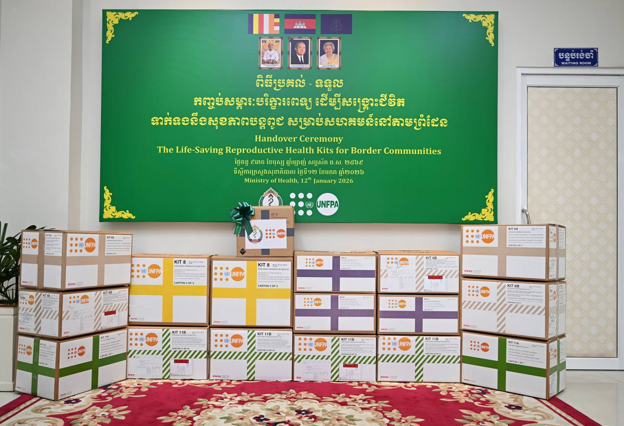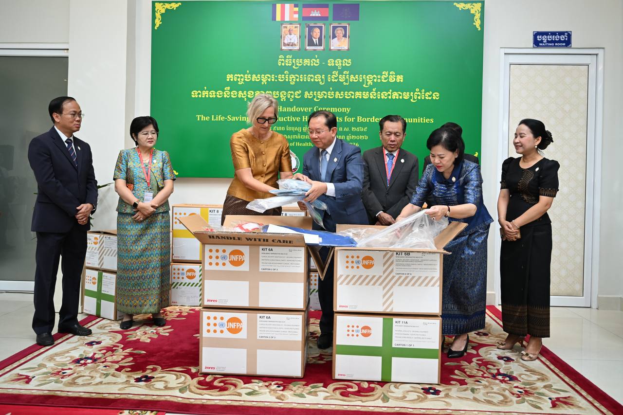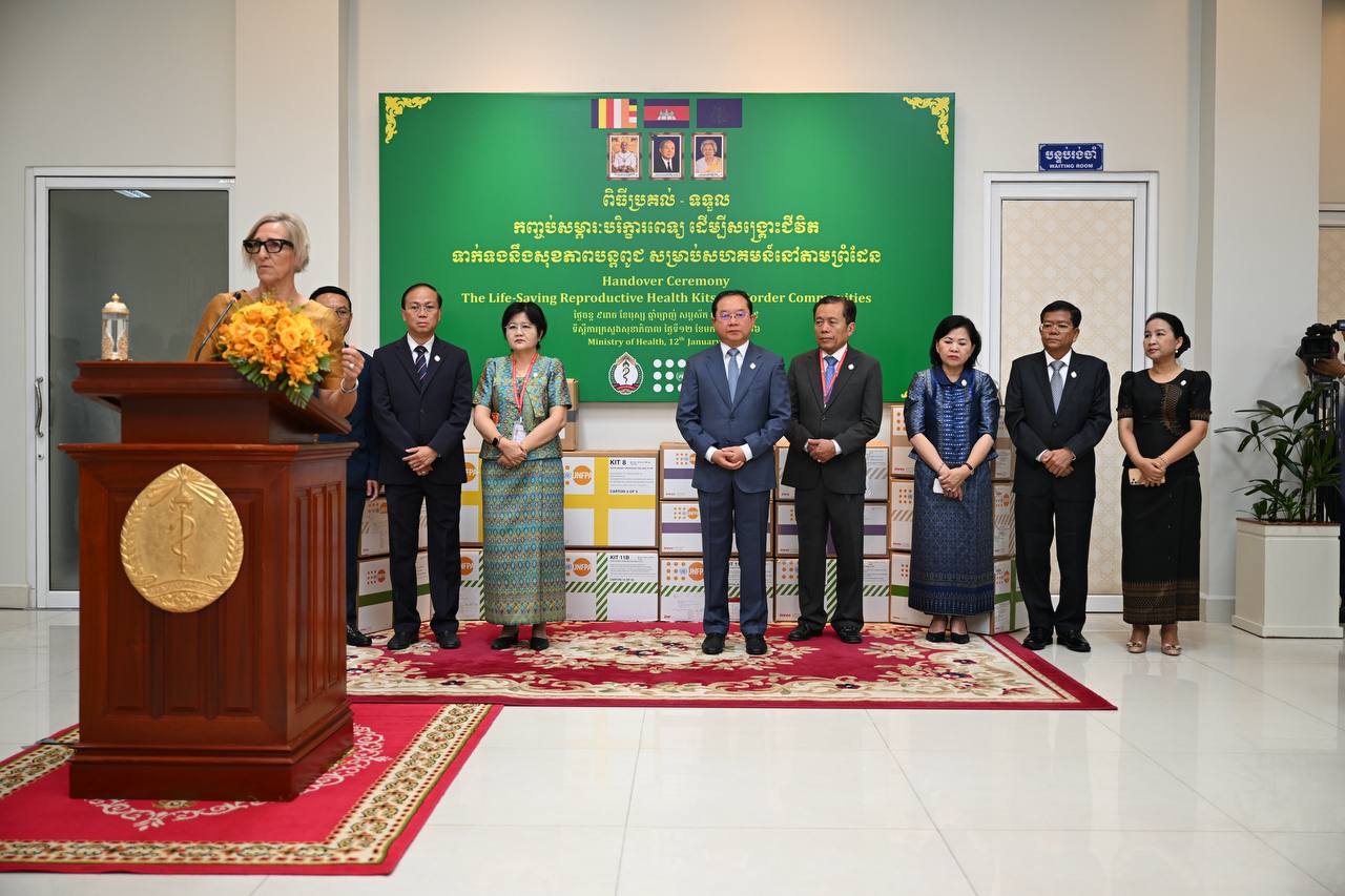 រាជធានីភ្នំពេញ៖ តំណាងមូលនិធិប្រជាជននៃអង្គការសហប្រជាជាតិប្រចាំកម្ពុជា (UNFPA) លោកស្រី សានត្រា បឺនក្លាវ (Sandra Bernklau) នៅថ្ងៃទី១២ ខែមករា ឆ្នាំ២០២៦នេះ បាននាំយកសម្ភារបរិក្ខារពេទ្យចំនួន៧០កញ្ចប់ ប្រគល់ដល់ក្រសួងសុខាភិបាលកម្ពុជា ដើម្បីសង្គ្រោះជីវិត និងគាំពារសុខភាពបន្តពូជនៅសហគមន៍តាមព្រំដែនមានជម្លោះជាប់ប្រទេសថៃ។