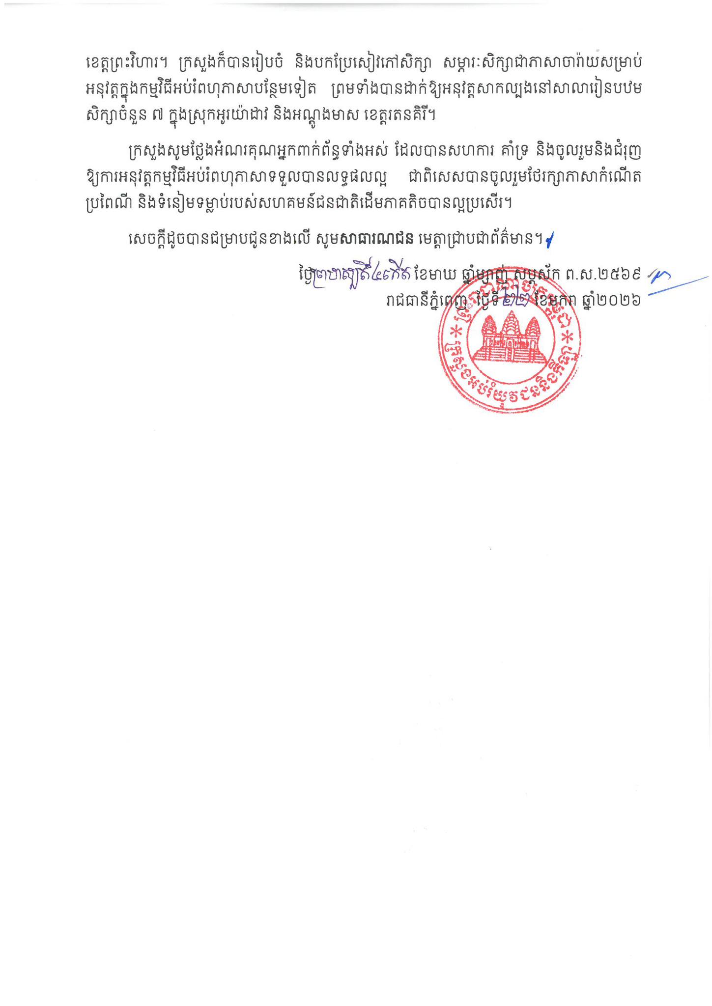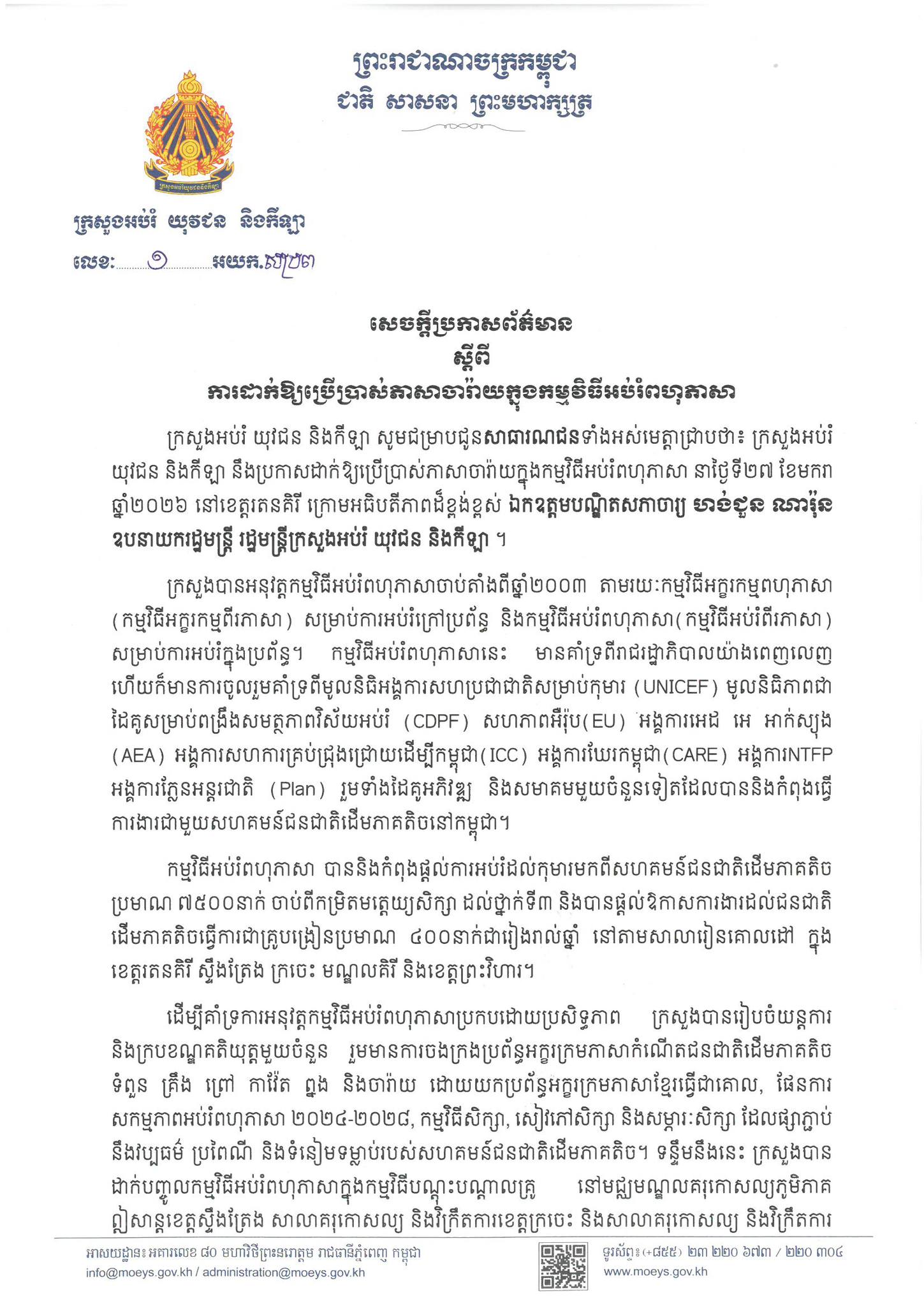រាជធានីភ្នំពេញ៖ លោកឧបនាយករដ្ឋមន្ត្រី ហង់ជួន ណារ៉ុន រដ្ឋមន្ត្រីក្រសួងអប់រំ យុវជន និងកីឡា នឹងដាក់បញ្ចូល«ភាសាចារ៉ាយ»ក្នុងកម្មវិធីអប់រំពហុភាសា នៅខេត្តរតនគិរី ចាប់ពីថ្ងៃទី២៧ ខែមករា ឆ្នាំ២០២៦។ កម្មវិធីអប់រំពហុភាសា ត្រូវបានបង្កើតឡើងតាំងតែពីឆ្នាំ២០០៣ ដោយមានការគាំទ្រពីរាជរដ្ឋាភិបាល និងអង្គការនានា ហើយក្នុងកម្មវិធីនេះ បែងចែកជាកម្មវិធីអក្ខរកម្មពហុភាសា សម្រាប់ការអប់រំក្រៅប្រព័ន្ធ និងកម្មវិធីអប់រំពហុភាសា សម្រាប់ការអប់រំក្នុងប្រព័ន្ធ។