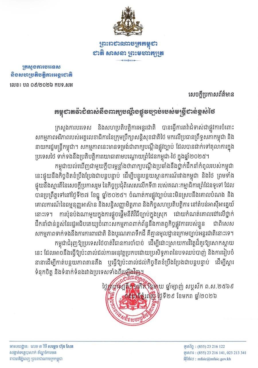 រាជធានីភ្នំពេញ៖ កម្ពុជា តាមរយៈក្រសួងការបរទេស និងសហប្រតិបត្តិការអន្តរជាតិ នៅថ្ងៃទី២៩ ខែមករា ឆ្នាំ២០២៦ បានតវ៉ាជំទាស់ជាផ្លូវការ ចំពោះសកម្មភាពអរិភាពរបស់អគ្គលេខាធិការនៃក្រុមប្រឹក្សាសន្តិសុខជាតិថៃ មកលើប្រធានព្រឹទ្ធសភា និងនាយករដ្ឋមន្ត្រីកម្ពុជា។ ការតវ៉ារបស់កម្ពុជា កើតឡើងក្រោយ លោក ឆាត់ឆៃ បាងឈួត (ฉัตรชัย บางชวด) អគ្គលេខាធិការនៃក្រុមប្រឹក្សាសន្តិសុខជាតិ(ថៃ) ដាក់ពាក្យប្តឹងមេដឹកនាំកម្ពុជាទាំងពីរនៅខេត្តសុរិន្ទ នឹងទាមទារឱ្យមានការឃាត់ខ្លួន ដោយចោទថា បានប្រើកម្លាំងវាយប្រហារទីតាំងជនស៊ីវិលថៃ...។(Sic)