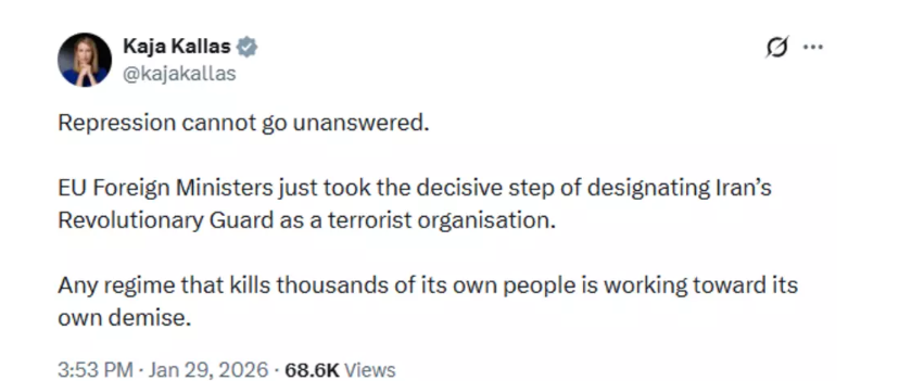 ប្រមុខគោលនយោបាយការបរទេស EU លោកស្រី កាចា ខាលលី (Mrs.Kaja Kallas) បានសរសេរលើបណ្ដាញសង្គម X ថា៖«ការធ្វើទុក្ខបុកម្នេញ មិនអាចកើតឡើងដោយគ្មានការឆ្លើយតបឡើយ។ របបណាដែលសម្លាប់ប្រជាជនខ្លួនឯងរាប់ពាន់នាក់ គឺកំពុងដើរឆ្ពោះទៅរកការដួលរលំដោយខ្លួនឯង»។ ការដាក់បញ្ចូលក្នុងបញ្ជីខ្មៅនេះ នឹងធ្វើឱ្យកងកម្លាំងឆ្មាំបដិវត្តន៍អ៊ីរ៉ង់ មានឋានៈស្មើនឹងក្រុមអាល់កៃដា (al-Qaeda), ក្រុមហាម៉ាស (Hamas) និងក្រុមដាអ៊ីស (Daesh)។ លោកស្រី កាចា ខាលលី បានបញ្ជាក់យ៉ាងច្បាស់ថា៖«ប្រសិនបើអ្នកធ្វើសកម្មភាពដូចភេរវករ អ្នកត្រូវតែត្រូវបានគេប្រកាសថា ជាភេរវករដូចគ្នា»។ បន្ថែមលើនេះ ប្លុកដែលមានសមាជិក២៧ប្រទេសមួយនេះ ក៏បានដាក់ទណ្ឌកម្មលើមន្ត្រីអ៊ីរ៉ង់ចំនួន១៥រូប រួមទាំងមេបញ្ជាការកំពូលៗនៃកងឆ្មាំបដិវត្តន៍ផងដែរ ចំពោះការទទួលខុសត្រូវក្នុងអំពើហិង្សាបណ្ដាលឱ្យបាតុកររាប់ពាន់នាក់បាត់បង់ជីវិត។