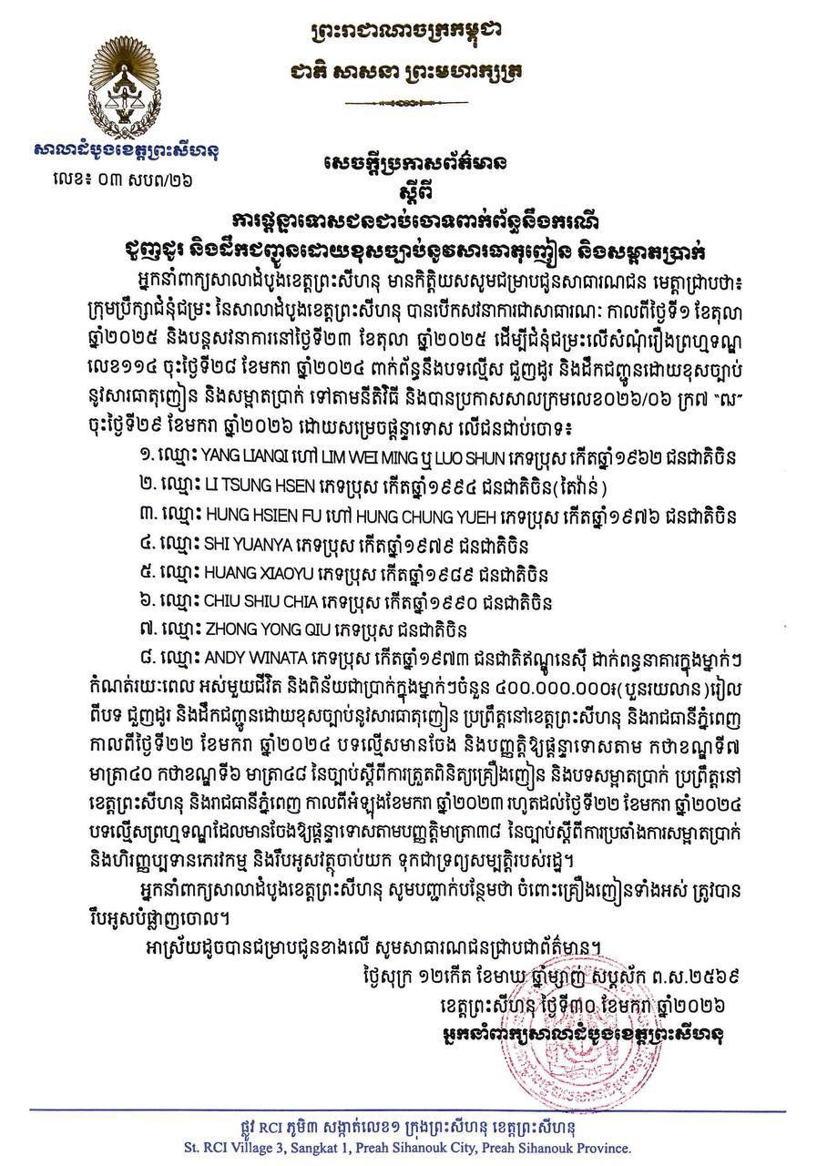 ក្រុងព្រះសីហនុ៖ តុលាការខេត្តព្រះសីហនុ សម្រេចផ្តន្ទាទោសជនជាប់ចោទបរទេស៨នាក់ ឱ្យជាប់ពន្ធនាគារអស់មួយជីវិត និងពិន័យម្នាក់ៗ៤០០លានរៀលថែមទៀត ពាក់ព័ន្ធករណីជួញដូរសារធាតុញៀនប្រមាណ១,៥តោន និងសម្អាតប្រាក់។ នេះបើតាមសេចក្ដីប្រកាសព័ត៌មានរបស់តុលាការខេត្តព្រះសីហនុ នៅថ្ងៃទី៣០ ខែមករា ឆ្នាំ២០២៦..។