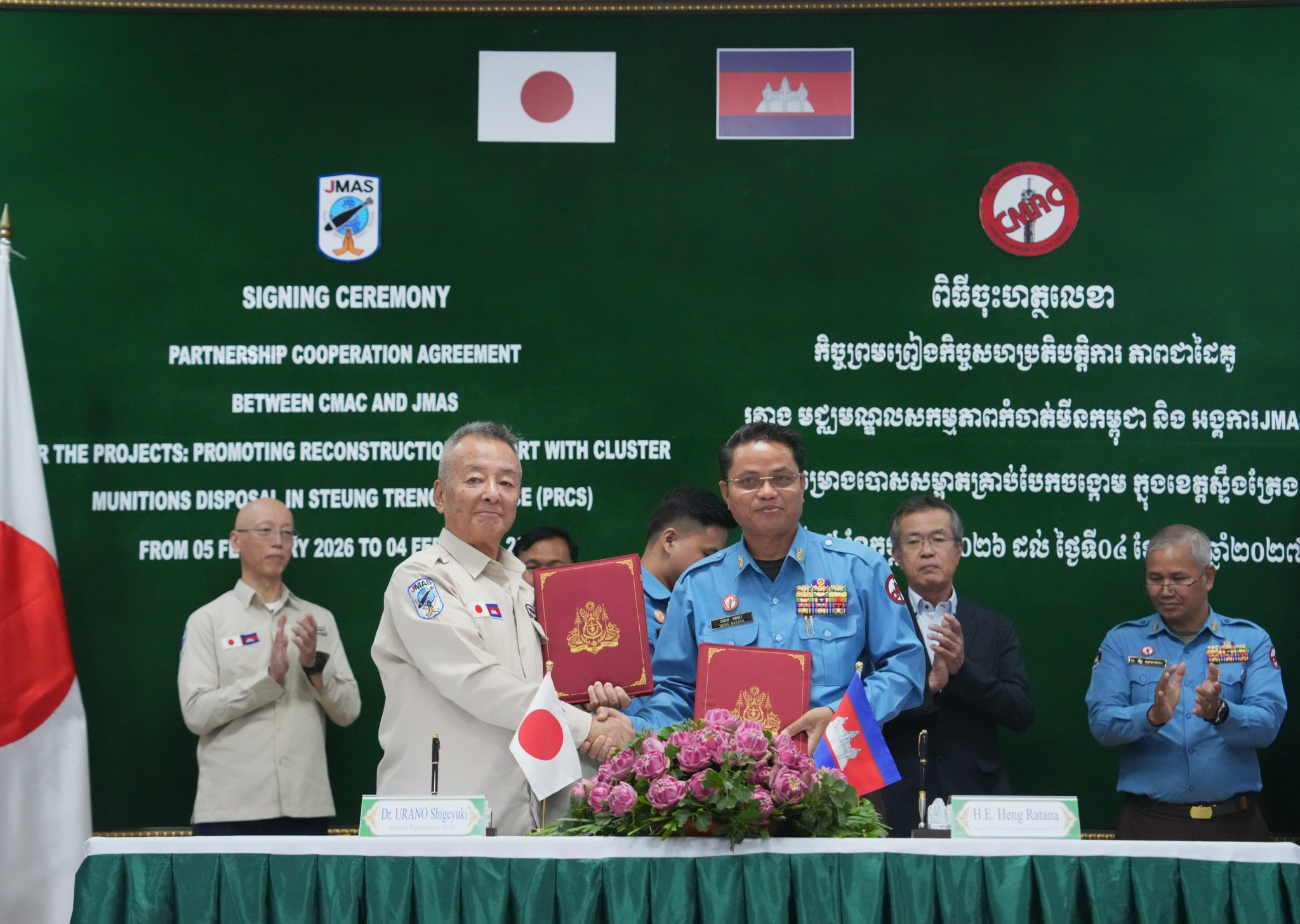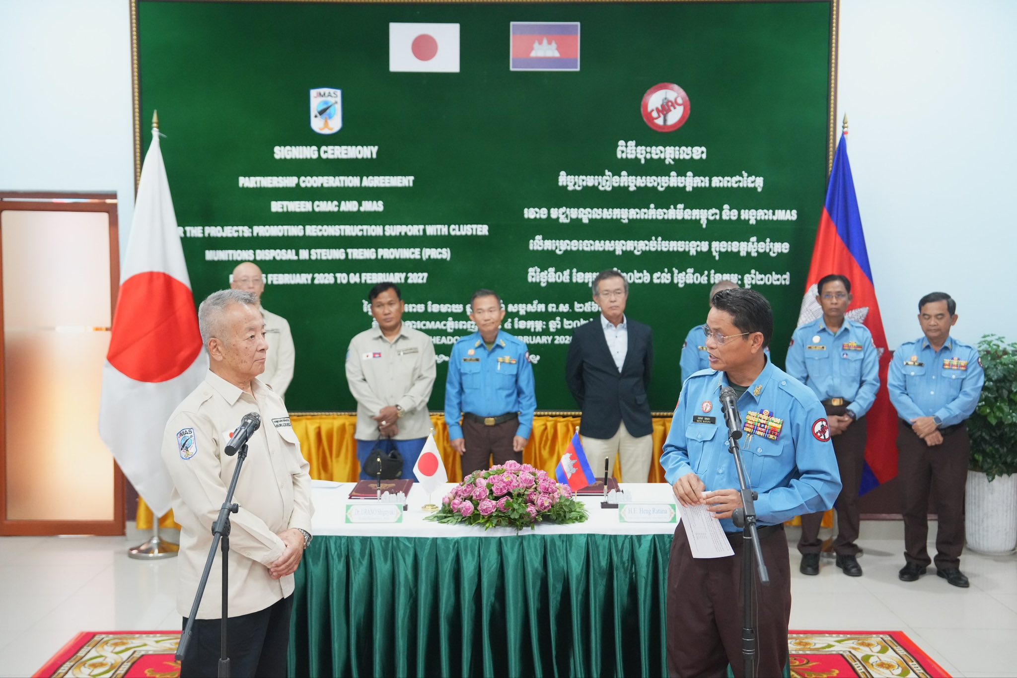 អគ្គនាយកមជ្ឈមណ្ឌលសកម្មភាពកម្ចាត់មីនកម្ពុជា (ស៊ីម៉ាក់) លោក ហេង រតនា និងលោក អឺនរ៉ាន ស៊ីហ្គេយូគិ (Mr.UNRAN Shigeyuki) ប្រធានអង្គការចេម៉ាស (JMAS) ប្រចាំកម្ពុជា បានចុះហត្ថលេខាលើកិច្ចសហប្រតិបត្តិការភាពជាដៃគូទ្វេភាគី កាលពីថ្ងៃទី៤កុម្ភៈ ឆ្នាំ២០២៦។ កិច្ចសហប្រតិបត្តិការនេះ អនុញ្ញាតឱ្យមន្ត្រីជំនាញអង្គភាពទាំងពីរ សហការគ្នាអនុវត្តគម្រោងបោសសម្អាតគ្រាប់បែកចង្កោមចាប់ពីថ្ងៃទី៥កុម្ភៈនេះ រហូតដល់ថ្ងៃទី៤កុម្ភៈ ឆ្នាំ២០២៧។ ការបោសសម្អាត ត្រូវធ្វើឡើងលើផ្ទៃដីប្រមាណជាង៣០០ហិកតា ក្នុងភូមិសាស្ត្រខេត្តស្ទឹងត្រែង ដែលមានថវិកាគម្រោងជាង១៨ម៉ឺនដុល្លារអាម៉េរិក និងថវិកាក្នុងគម្រោងមួយចំនួនទៀត អង្គការចេម៉ាស ជួយអភិវឌ្ឍន៍សហគមន៍ដោយផ្ទាល់។