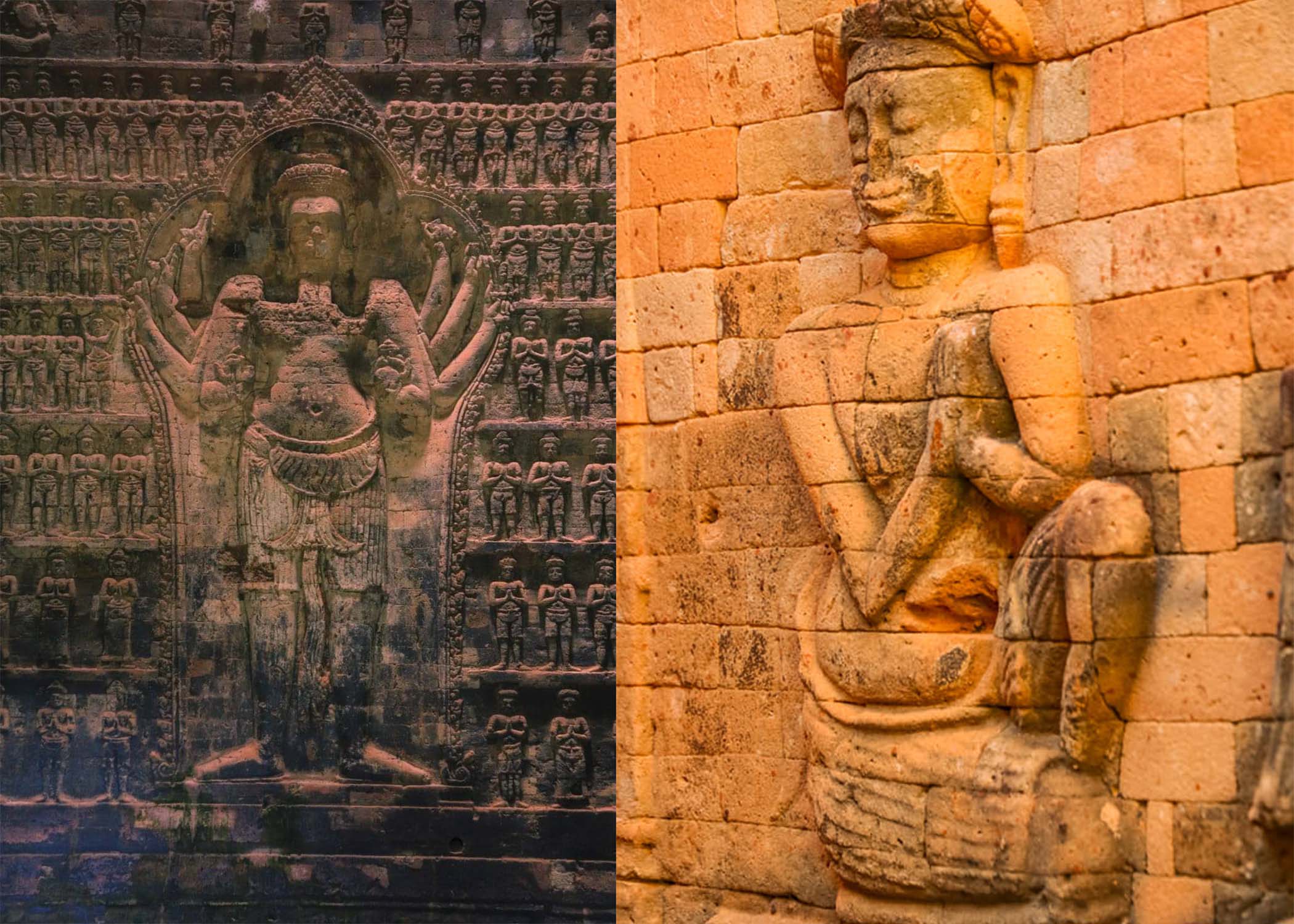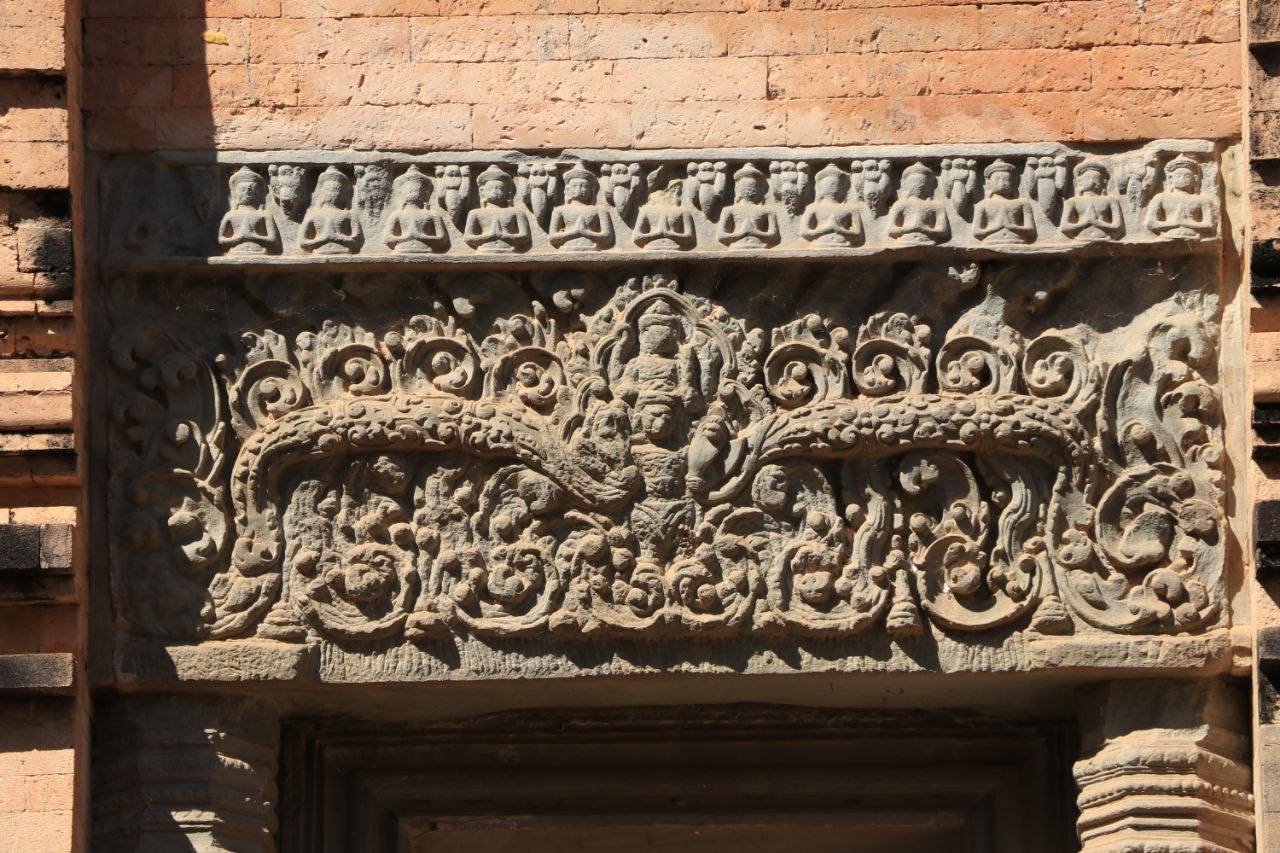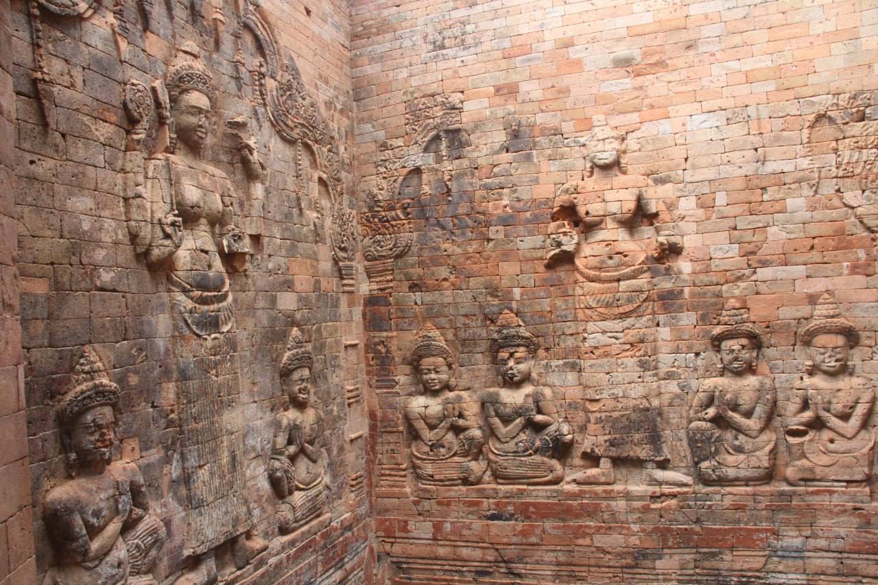 អាជ្ញាធរជាតិអប្សរា បានឱ្យដឹងថា តួប៉មទាំងប្រាំរបស់ប្រាសាទ បែរមុខទៅទិសខាងកើត តាមខ្លោងទ្វារមួយបើកចំហ និងទិសបីទៀតមានទ្វារបញ្ឆោត សសរ និងផ្តែរធ្វើអំពីថ្មភក់។ ក្នុងចំណោមតួទាំងប្រាំនេះ មានតែតួកណ្តាល និងតួជាប់ខាងជើងទេ ដែលមានចម្លាក់បដិមាលើជញ្ជាំងផ្ទៃខាងក្នុង រីឯជញ្ជាំងលើតួដទៃទៀត ទំនងជាពុំទាន់បានឆ្លាក់រចនាសម្រេច។ នៅតាមជញ្ជាំងទាំងបីនៃតួកណ្តាល មានក្បាច់ចម្លាក់រឿងព្រះនារាយណ៍ (វិស្ណុ) សំខាន់ៗ ដូចជា៖ ត្រីវិក្រម (អវតាជាព្រាហ្មតឿ), ព្រះនារាយណ៍ដៃប្រាំបី មានរូបក្រពើនៅពីលើ និងចម្លាក់ព្រះនារាយណ៍គង់លើយានជំនិះគ្រុឌ។ លើសពីរូបចម្លាក់ ក៏មានរូបគំនូរត្របកផ្កាឈូកសំយុងចុះក្រោមមួយជួរ ព័ទ្ធជុំវិញផ្នែកខាងលើជាប់ពិដាន តែសព្វថ្ងៃរលុបស្ទើរអស់ហើយ។