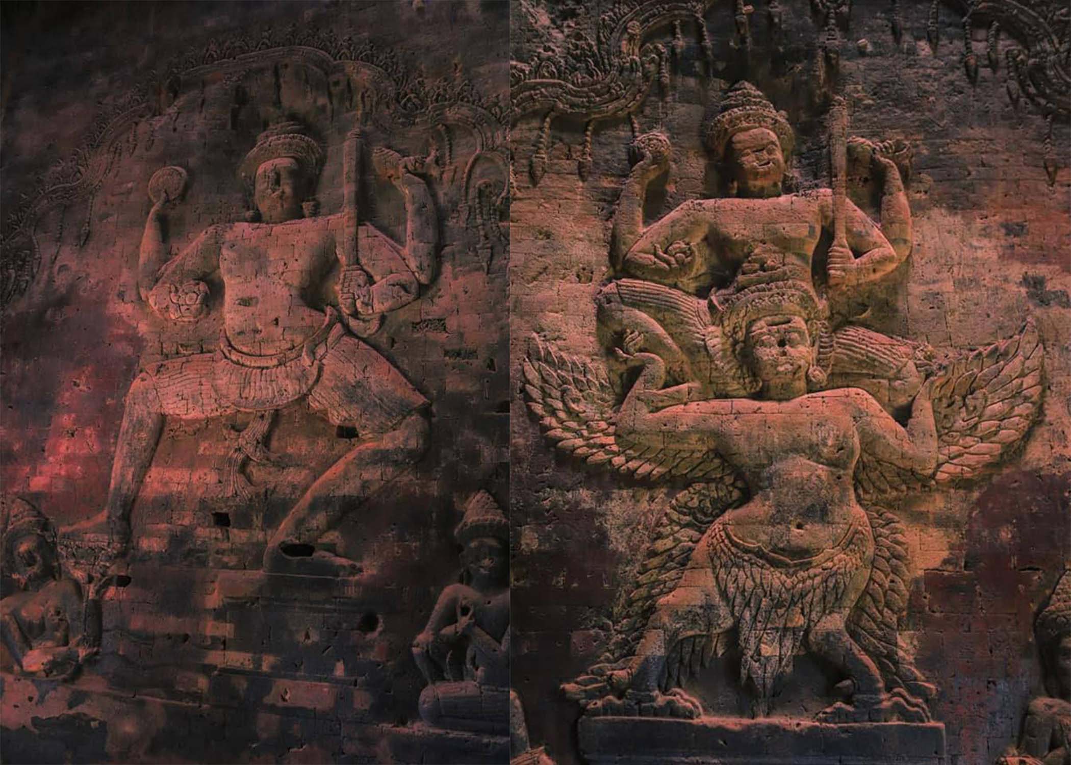 ចំណែកឯនៅលើជញ្ជាំងក្នុងតួខាងជើង បង្ហាញពីចម្លាក់រឿងព្រះជាយាព្រះនារាយណ៍ គឺព្រះនាងលក្ស្មី ហើយលើជញ្ជាំងខាងត្បូង ក៏មានបង្ហាញព្រះនាងលក្ស្មី អមដោយអ្នកហែហមពីររូបអង្គុយសងខាងដែរ។ អាជ្ញាធរជាតិអប្សរា បន្ថែមថា ប្រាសាទក្រវ៉ាន់ កសាងនៅឆ្នាំ៩២១ ក្នុងរាជព្រះបាទហស៌វរ្ម័នទី១ ដើម្បីឧទ្ទិសដល់ព្រះវិស្ណុ (ព្រះនារាយណ៍) ក្នុងព្រហ្មញ្ញសាសនា។ សូមជម្រាបថា កាលពីឆ្នាំ២០១៧ ចម្លាក់តោថ្មមួយនៅប្រាសាទក្រវ៉ាន់ មានសភាពទ្រុឌទ្រោមដោយបែកបាក់រូបរាងជាកំណាត់តូច-ធំ ត្រូវបានក្រុមអ្នកជំនាញអភិរក្សថ្ម នៃនាយកដ្ឋានអភិរក្សប្រាសាទក្នុងឧទ្យានអង្គរ និងបុរាណវិទ្យានៃអាជ្ញាធរជាតិអប្សរា ធ្វើការជួសជុល។ ក្រុមការងារបានប្រើបច្ចេកទេសជួសជុល សមស្របទៅតាមបទដ្ឋានដែលអាចធានាបាននូវលក្ខណៈដើម និងសុវត្ថិភាពយូរអង្វែង។