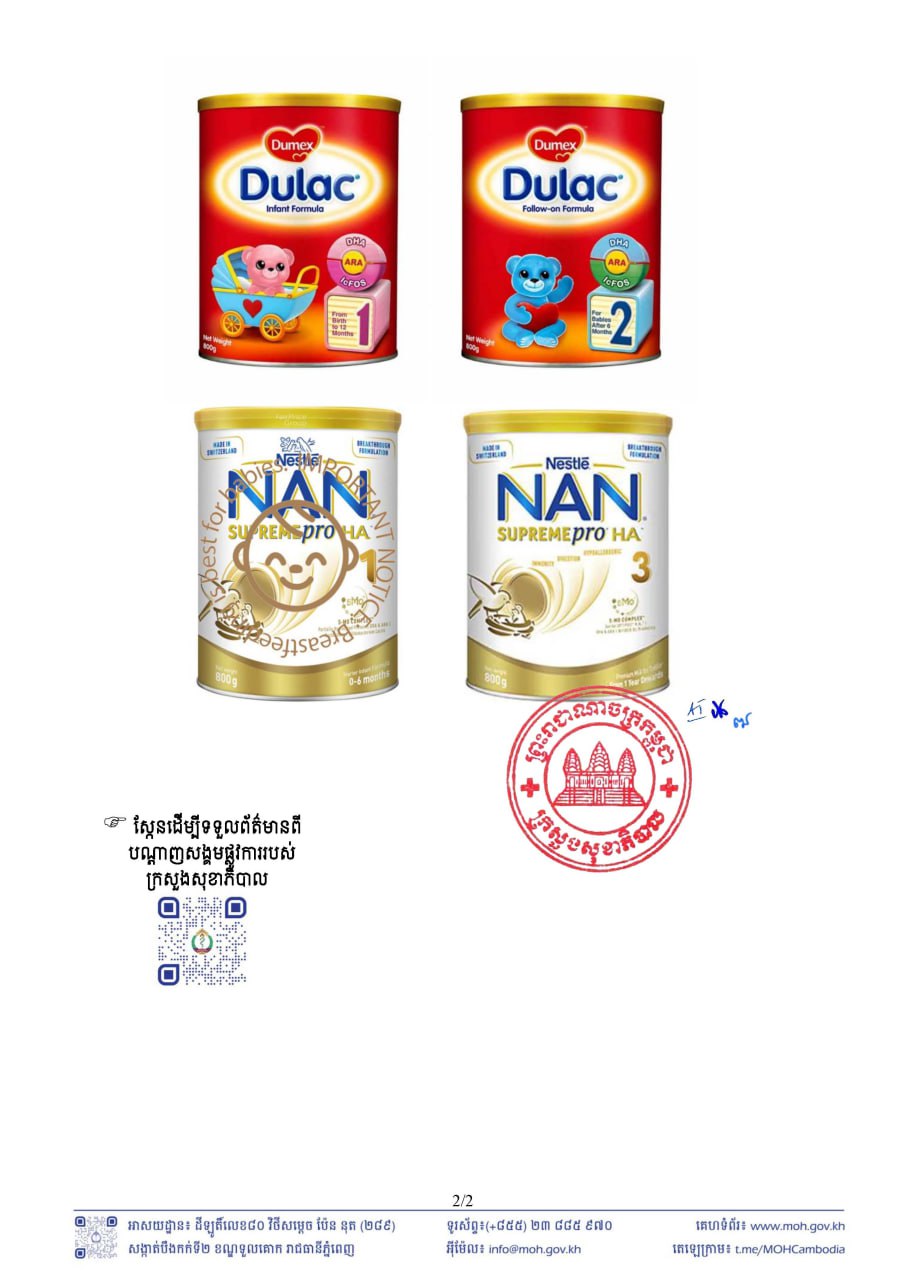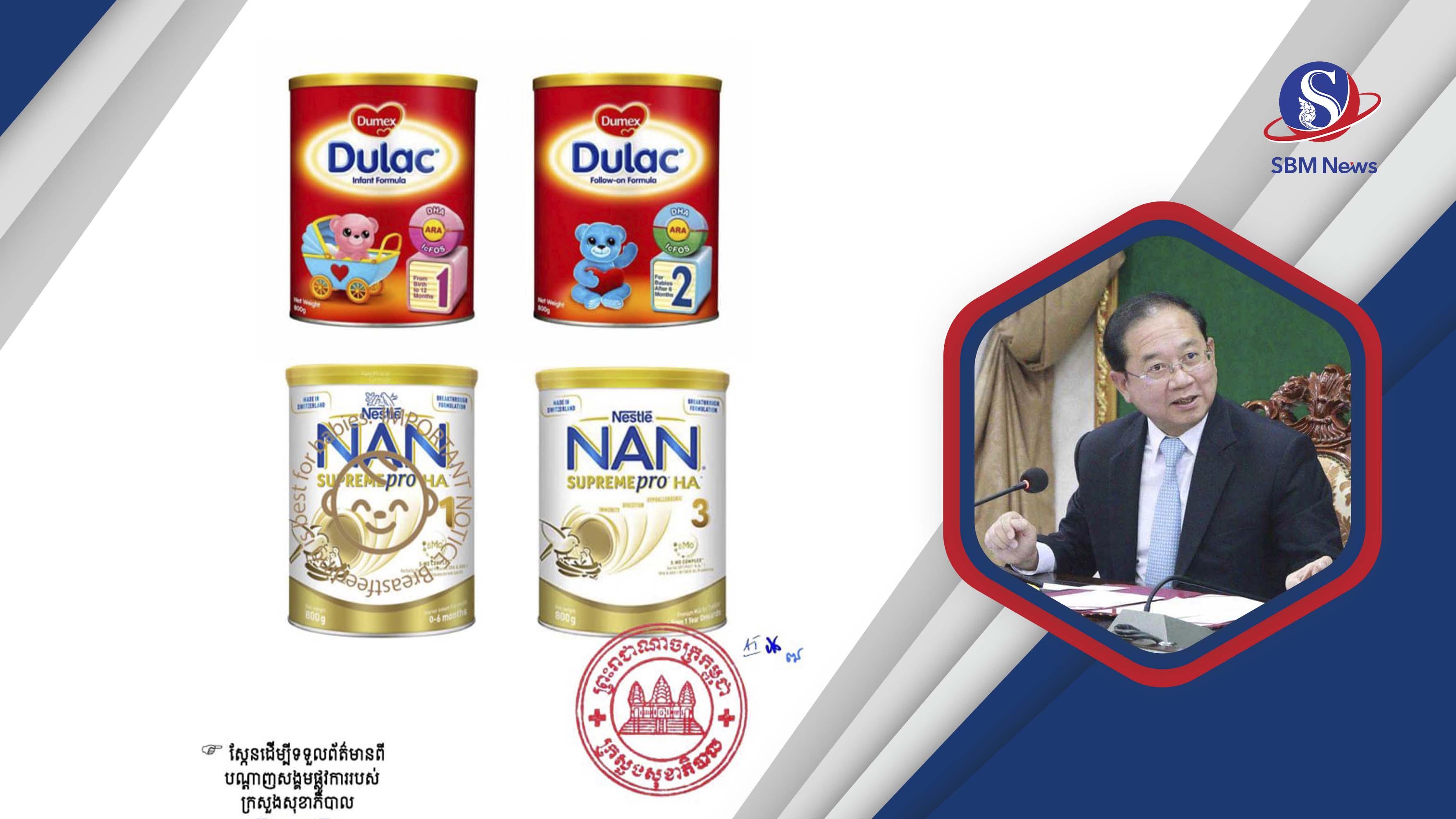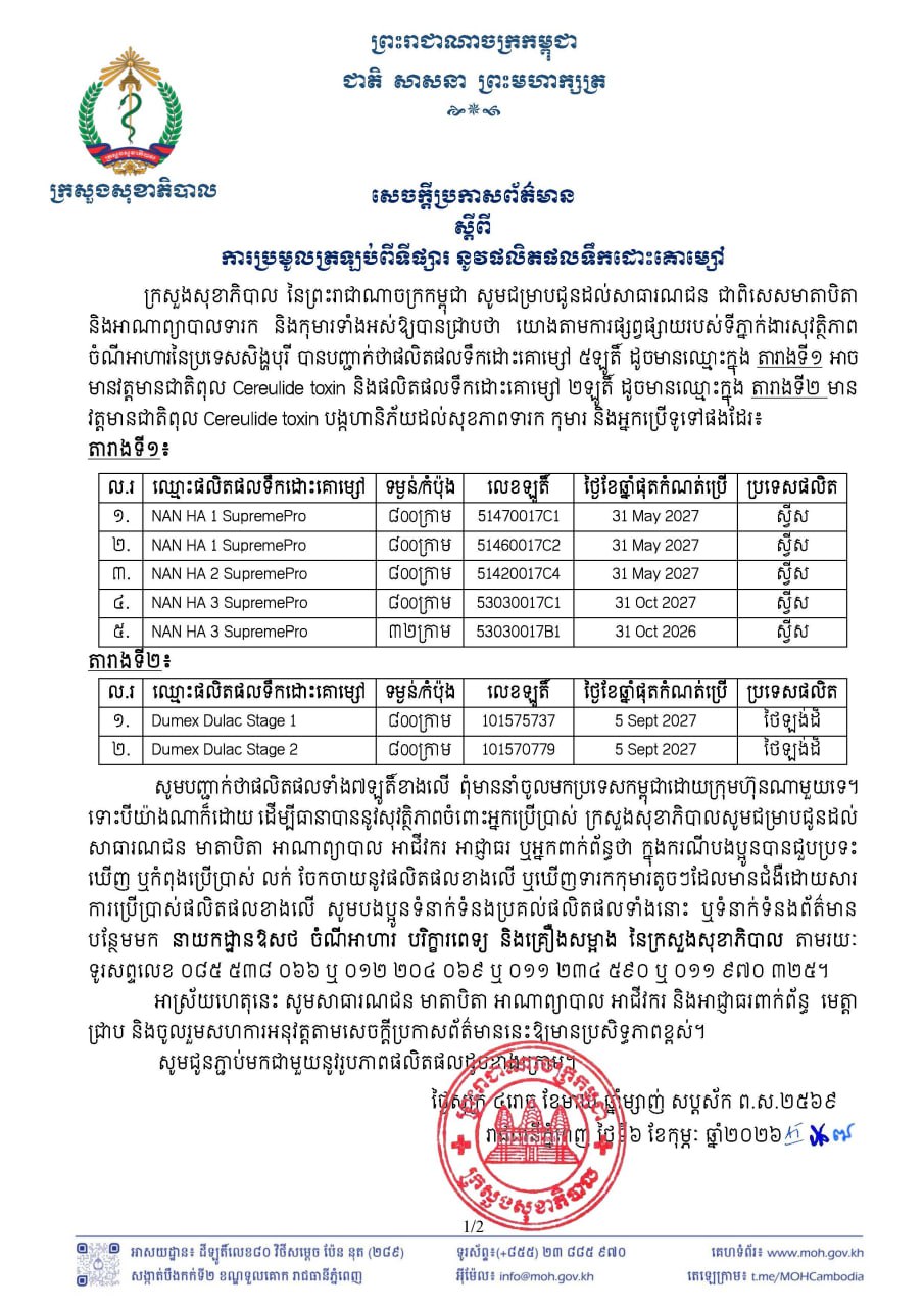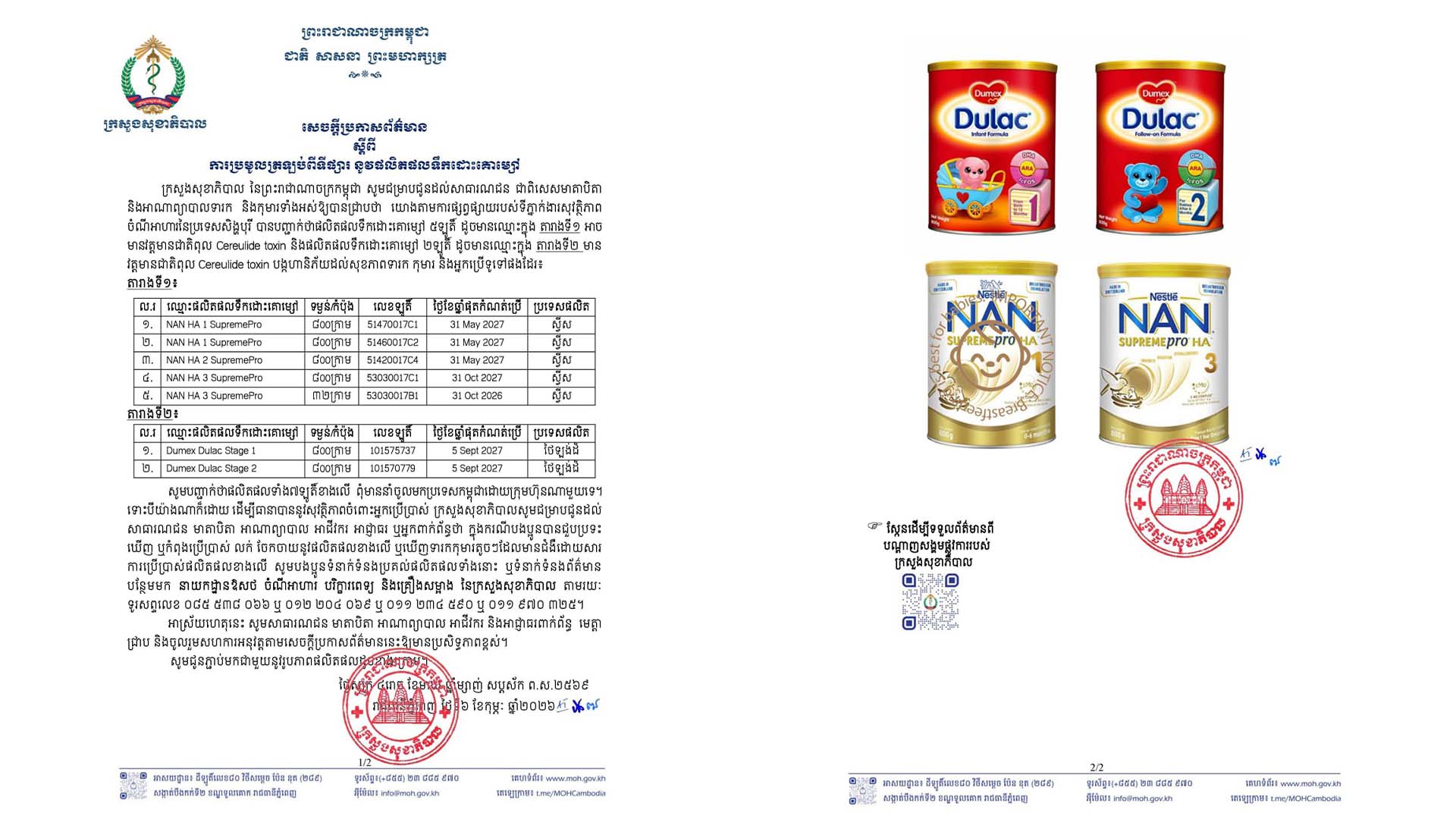 ក្នុងសេចក្តីប្រកាសព័ត៌មាន ក្រសួងសុខាភិបាលកម្ពុជា បានបង្ហាញពីការផ្សព្វផ្សាយរបស់ទីភ្នាក់ងារសុវត្ថិភាពចំណីអាហារនៃប្រទេសសិង្ហបុរី ស្តីពីការសង្ស័យមានជាតិពុល Cereulide toxin (សេរ៉ូឡាយ ថកស៊ីន) លើផលិតផលទឹកដោះគោម្សៅបង្កហានិភ័យដល់សុខភាពទារកនិងកុមារ។ ទឹកដោះគោម្សៅទាំងនោះ រួមមាន៖ ឈ្មោះ NAN HA ចាប់ពីលេខ១ រហូតដល់លេខ៣ ចំណុះ៨០០ក្រាម និង៣២ក្រាម ជាផលិតផលប្រទេសស្វីស កាលបរិច្ឆេទផុតកំណត់ថ្ងៃទី៣១ ឧសភា និងថ្ងៃទី៣១តុលា ឆ្នាំ២០២៧។ រីឯម្សៅទឹកដោះគោមួយទៀតជាផលិតផលថៃ ឈ្មោះ Dumex Dulac Stage មានលេខ១ និងលេខ២ ចំណុះ៨០០ក្រាម កាលបរិច្ឆេទផុតកំណត់ថ្ងៃទី៥កញ្ញា ឆ្នាំ២០២៧។