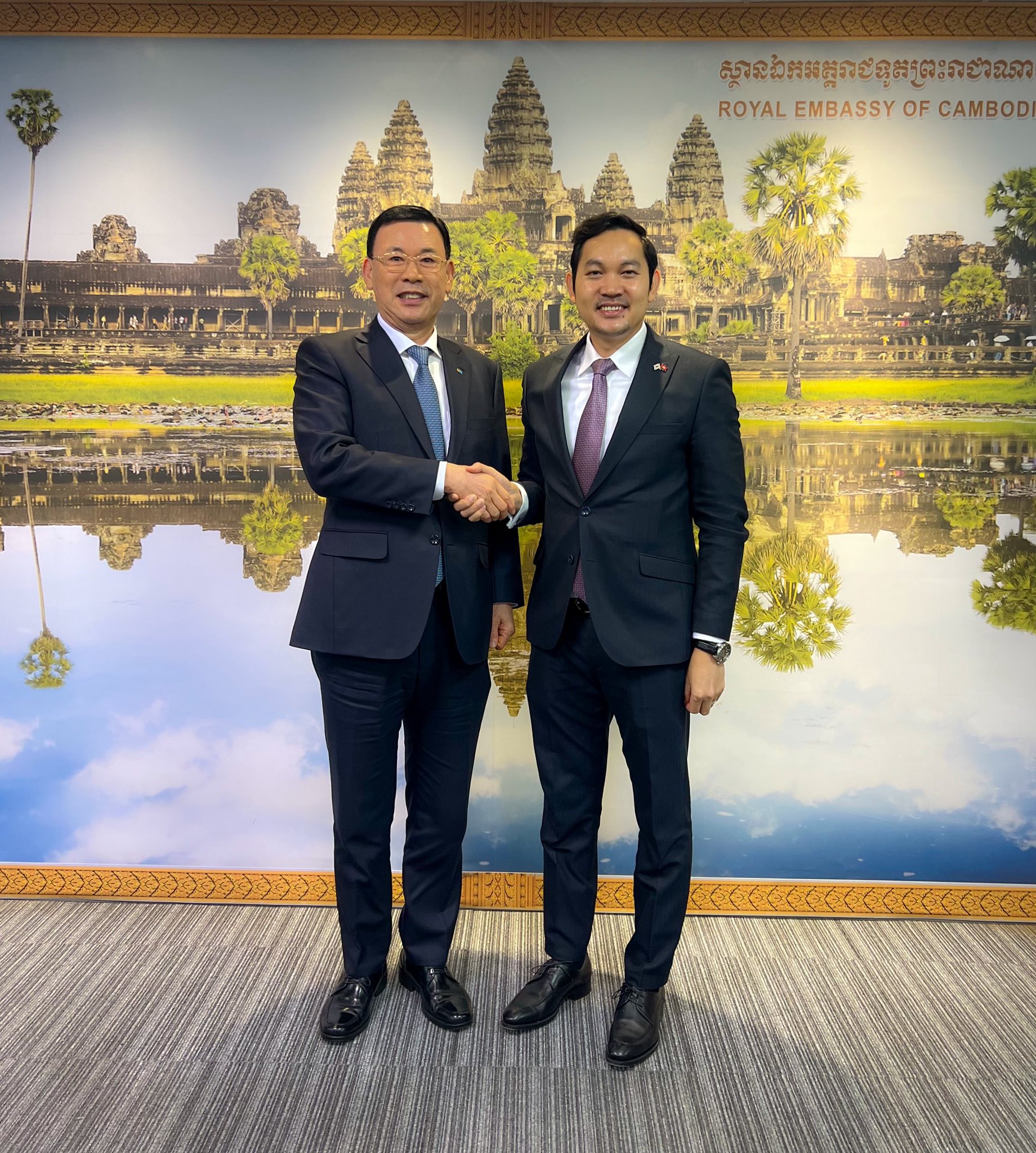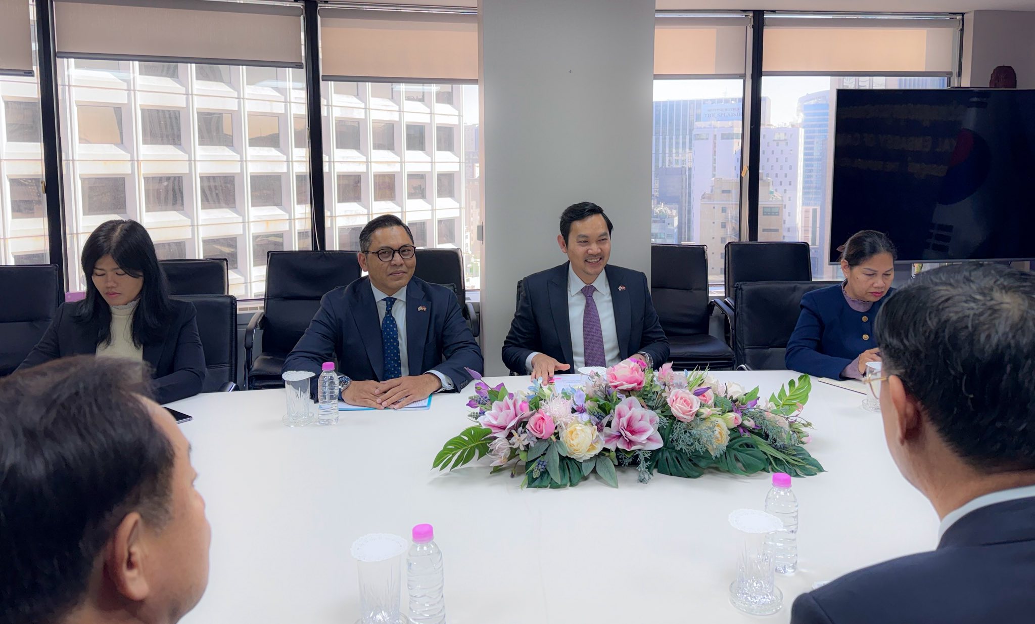 ឯកអគ្គរាជទូតកម្ពុជាប្រចាំសាធារណរដ្ឋកូរ៉េ លោក ឃួន ផុនរតនៈ ក្នុងជំនួបសម្ដែងការគួរសម និងពិភាក្សាការងារជាមួយប្រធានក្រុមប្រឹក្សាភិបាល ក្រុមហ៊ុន Daejoo KC លោក PARK JOO BONG នៅថ្ងៃទី៩កុម្ភៈនេះ បានលើកឡើងពីបច្ចុប្បន្នភាពនៃទំនាក់ទំនងរវាងកម្ពុជា-កូរ៉េ ផ្តោតលើវិស័យពាណិជ្ជកម្ម ទេសចរណ៍ និងការផ្លាស់ប្ដូរ រវាងប្រជាជន និងប្រជាជន។ លើសពីនេះ មន្ត្រីទូតកម្ពុជា ក៏បានបញ្ជាក់ប្រាប់ភាគីកូរ៉េ អំពីកិច្ចខិតខំប្រឹងប្រែងរបស់រាជរដ្ឋាភិបាលកម្ពុជា ក្នុងការស្តារស្ថានភាពទំនាក់ទំនងនៃប្រទេសទាំងពីរ ឱ្យត្រលប់ទៅរកប្រក្រតីភាពវិញ បន្ទាប់ពីមានបញ្ហានៃការភាន់ច្រឡំមួយចំនួនលើករណីឧក្រិដ្ឋកម្មអនឡាញស្កេម ដែលបានកើតឡើងកាលពីឆ្នាំ២០២៥។