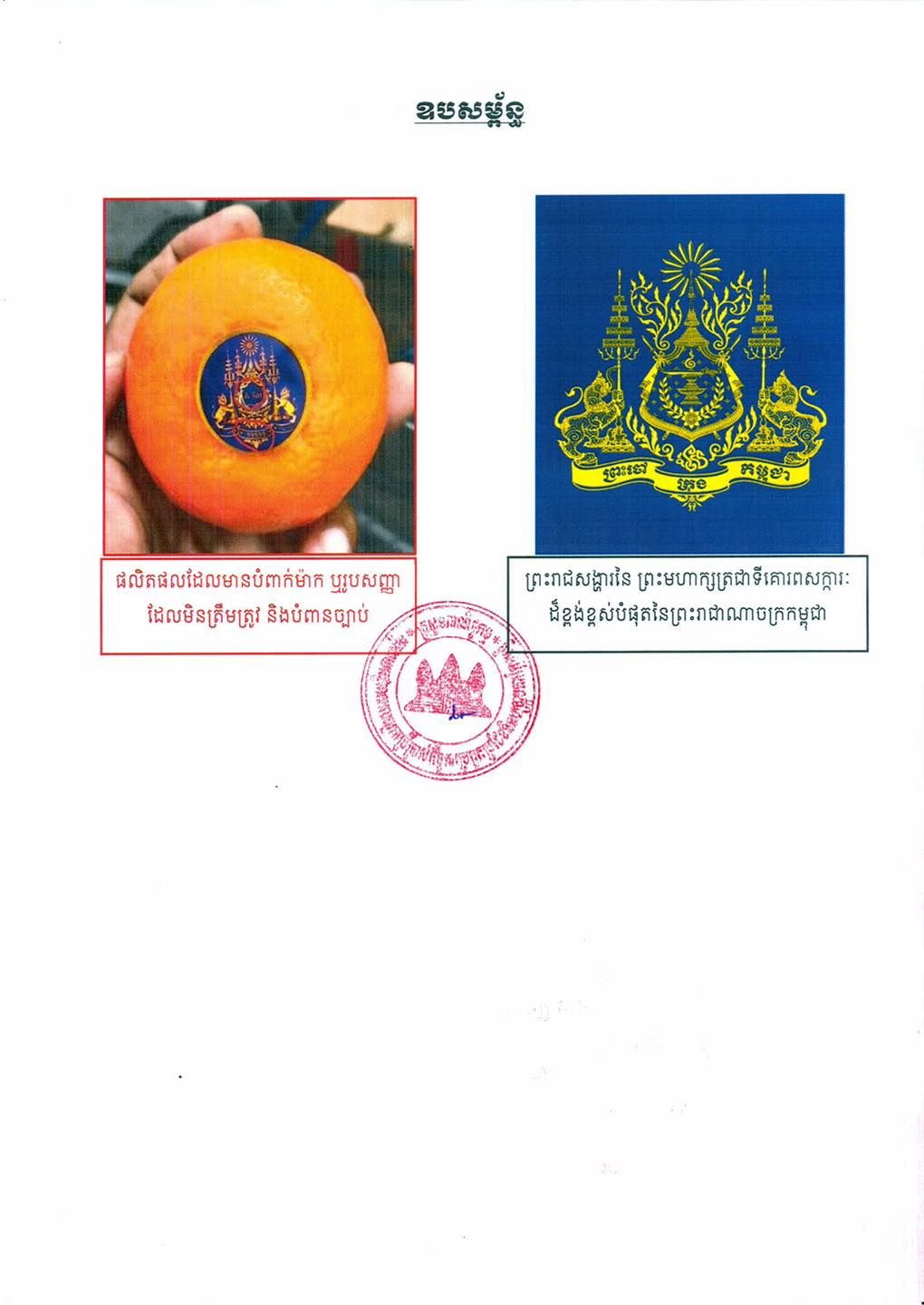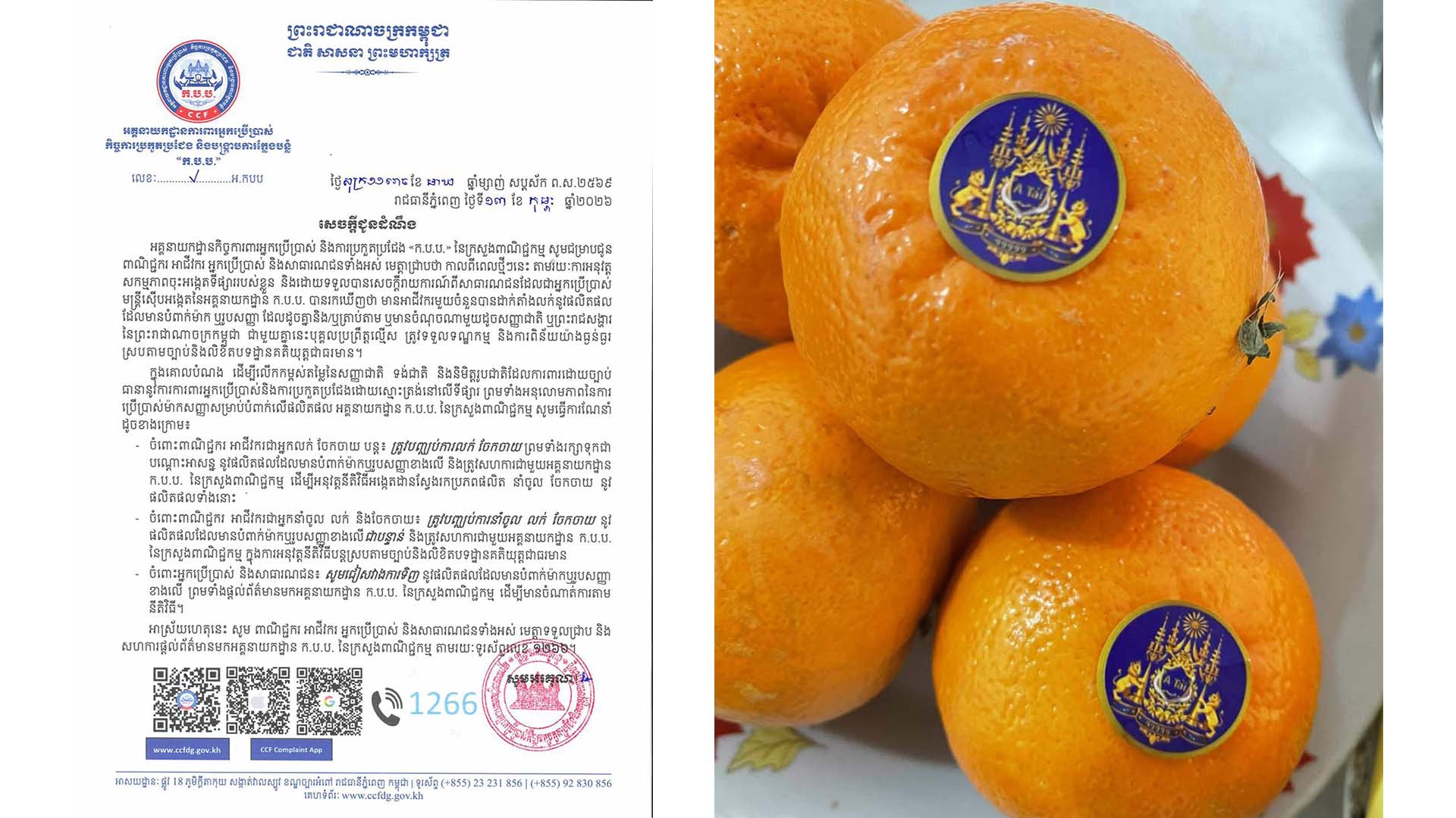 រាជធានីភ្នំពេញ៖ អគ្គនាយកដ្ឋានកិច្ចការពារអ្នកប្រើប្រាស់ និងការប្រកួតប្រជែង (ក.ប.ប.) ប្រកាសឱ្យសាធារណជន ជាពិសេសអ្នកលក់ ចែកចាយបន្តចូលរួមសហការជាមួយមន្ត្រីជំនាញ ដើម្បីស្វែងរកប្រភពនាំចូលផ្លែក្រូចបិទស្លាកដូចសញ្ញាជាតិ ឬព្រះរាជសង្ហារនៃកម្ពុជា..។