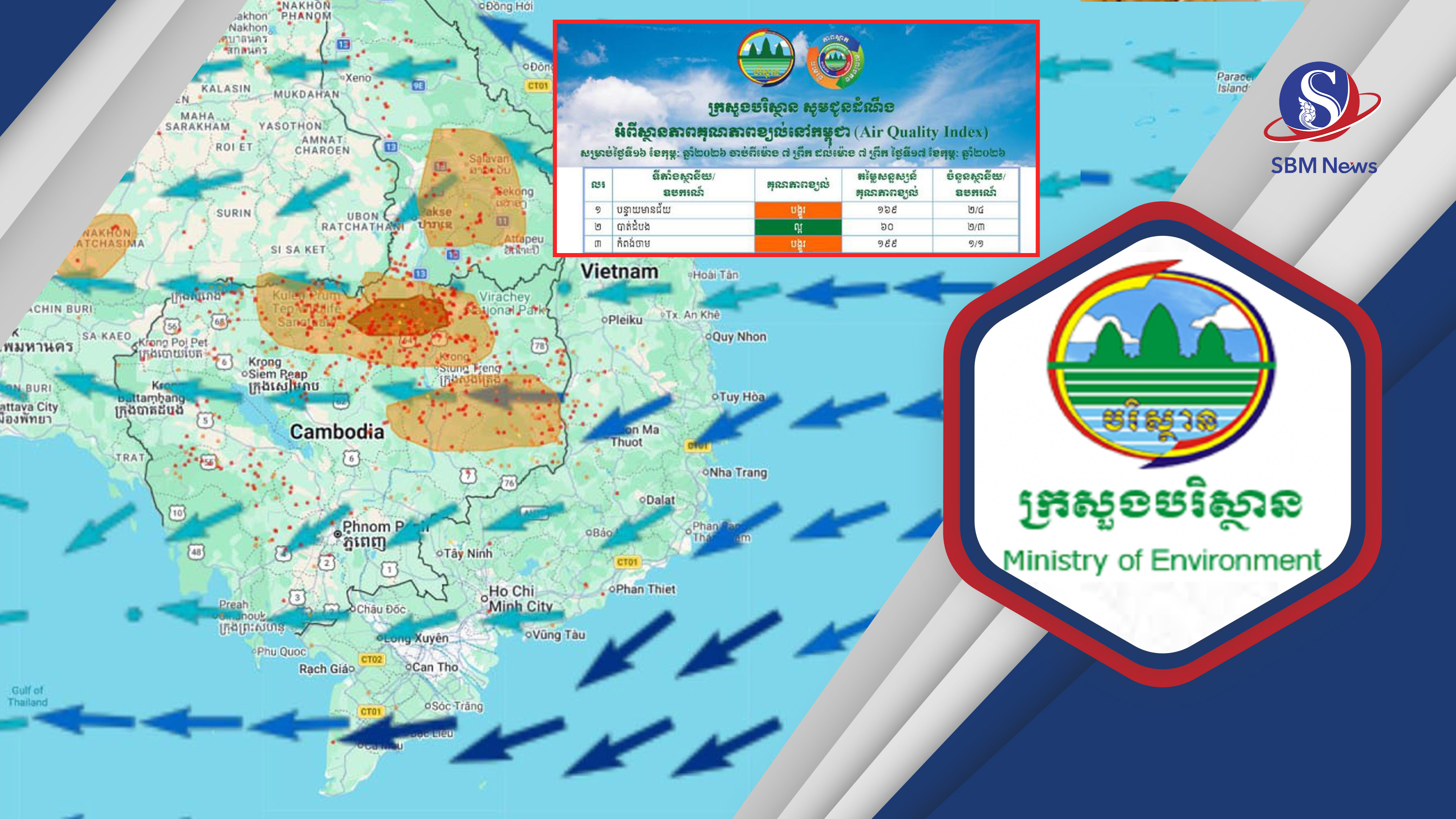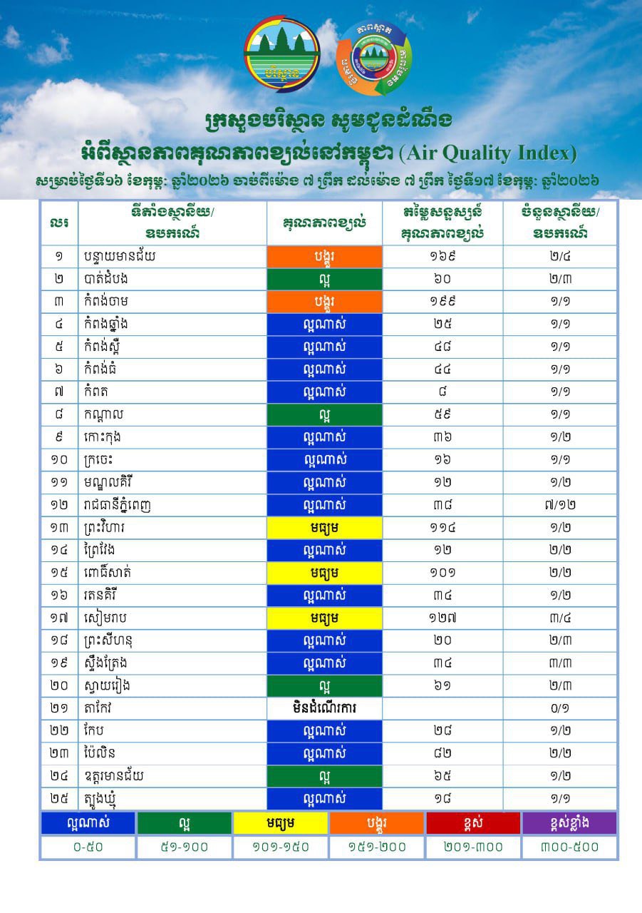 អន្តរខេត្ត៖ មន្រ្តីក្រសួងបរិស្ថាន នៅព្រឹកថ្ងៃទី១៧កុម្ភៈនេះ បានបង្ហាញរបាយការណ៍សន្ទស្សន៍ខ្យល់ពុលលើខេត្តបន្ទាយមានជ័យ និងកំពង់ចាមមាន«កម្រិតមធ្យម» ខណៈខេត្តព្រះវិហារ សៀមរាប ពោធិ៍សាត់ មានការបំពុលកម្រិតស្រាល។ យ៉ាងណា មន្រ្តីបរិស្ថាន បានអំពាវនាវឱ្យបងប្អូនប្រជាពលរដ្ឋចូលរួមទប់ស្កាត់ និងកាត់បន្ថយការបំពុលខ្យល់ពីសកម្មភាពផ្សេងៗ…។