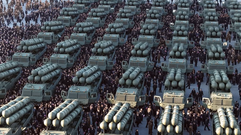 រដ្ឋធានីព្យុងយ៉ាង៖ មេដឹកនាំកូរ៉េខាងជើង លោកគីម ជុងអ៊ុន បានរៀបចំពិធីបង្អួតសាច់ដុំយោធាដ៏មហិមា និងគួរឱ្យតក់ស្លុត ដោយបង្ហាញមុខរថយន្តបង្ហោះមីស៊ីលស៊េរីថ្មីសន្លាងចំនួន៥០គ្រឿង ដែលអាចផ្ទុកក្បាលគ្រាប់នុយក្លេអ៊ែរ កម្ទេចសត្រូវត្រឹមមួយប៉ប្រិចភ្នែក។ ការបញ្ចេញសព្វាវុធដ៏សន្ធឹកសន្ធាប់នេះ គឺជាសារព្រមានចុងក្រោយទៅកាន់កូរ៉េខាងត្បូង ចំពេលដែលមហាសន្និបាតបក្សពលករកូរ៉េជិតមកដល់...។