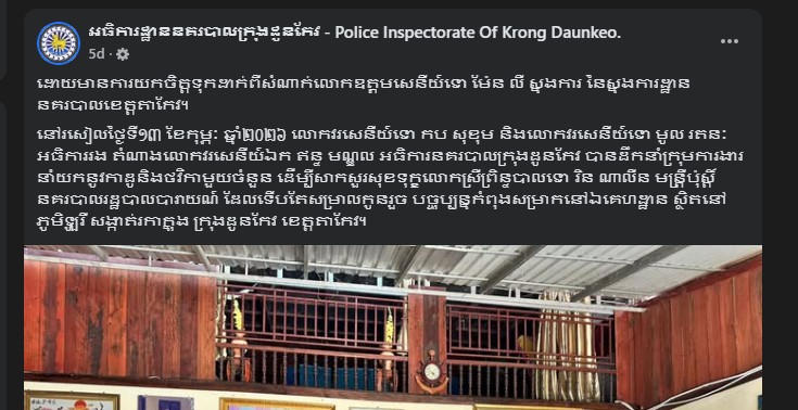 ក្រុងដូនកែវ៖ ធ្លាយដំណឹងថា លោកវរសេនីយ៍ឯក ឥន្ទ មណ្ឌល អធិការនៃអធិការដ្ឋាននគរបាលក្រុងដូនកែវ ត្រូវបានប្រមុខរាជរដ្ឋាភិបាលកម្ពុជា ចេញអនុក្រឹត្យដាក់ឱ្យចូលនិវត្តន៍ពីតួនាទីតាំងពីចុងឆ្នាំ២០២៥ ប៉ុន្តែរូបលោកនៅតែមកបំពេញការងារនៅអធិការដ្ឋាននគរបាលក្រុងដូនកែវ ជាធម្មតា។ យ៉ាងណា មហាជនមានចម្ងល់ថា តើការមិនចាកចេញពីតួនាទីរបស់លោកវរសេនីយ៍ឯក ឥន្ទ មណ្ឌល គឺជាការបង្ហាញឆន្ទៈស្រឡាញ់ការងារ ឬមួយក្រសោបតំណែងជាប់ មិនឱ្យអ្នកដទៃមកទទួលភារកិច្ចបន្ត..?