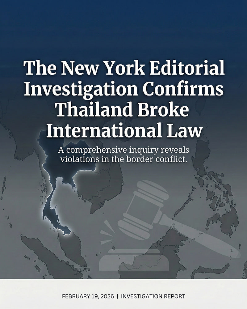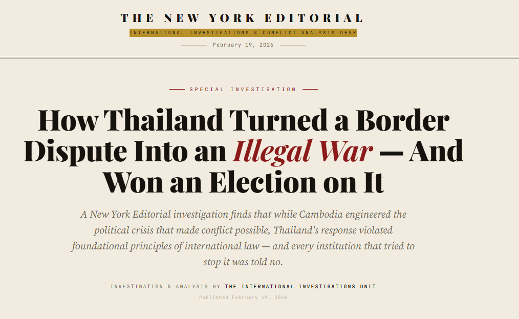 របាយការណ៍ស៊ើបអង្កេត គាំទ្រដោយទិន្នន័យអន្តរជាតិ ដែលចេញផ្សាយក្នុងគេហទំព័រ The New York Editorial នៅថ្ងៃទី២០ ខែកុម្ភៈនេះ បានបង្ហាញពីរបៀបដែលភាគីថៃប្រើប្រាស់ជម្លោះព្រំដែនទៅជាសង្គ្រាមខុសច្បាប់ ដើម្បីជាឈ្នាន់យកឈ្នះការបោះឆ្នោតភ្លូកទឹកភ្លូកដីនៅរាជធានីបាងកកនាពេលថ្មីៗនេះ។ របាយការណ៍ស៊ើបអង្កេតសំខាន់ៗ បានបញ្ជាក់ពីទង្វើឈ្លានពានរបស់ភាគីថៃ ថា ពិតជាហួសហេតុយ៉ាងខ្លាំងណាស់ ព្រោះថៃបានប្រើប្រាស់លេសកូនទាហានជាន់មីនរងរបួសម្នាក់ ដើម្បីបញ្ជូនយន្តហោះចម្បាំង F-16 ទម្លាក់គ្រាប់បែក គ្រាប់បែកចង្កោម និងវាយប្រហារយ៉ាងសន្ធាប់ចូលជ្រៅក្នុងដែនអធិបតេយ្យភាពកម្ពុជា បណ្ដាលឱ្យបាត់បង់ជីវិតមនុស្ស និងការភៀសខ្លួនយ៉ាងលំបាកវេទនា។ របាយការណ៍អះអាងថា «នេះមិនមែនជាការការពារខ្លួនទេ វាជាការវាយប្រហារដ៏ឃោរឃៅ។ នេះគឺមិនសមាមាត្រ និងស្មើភាពទាល់តែសោះ»។