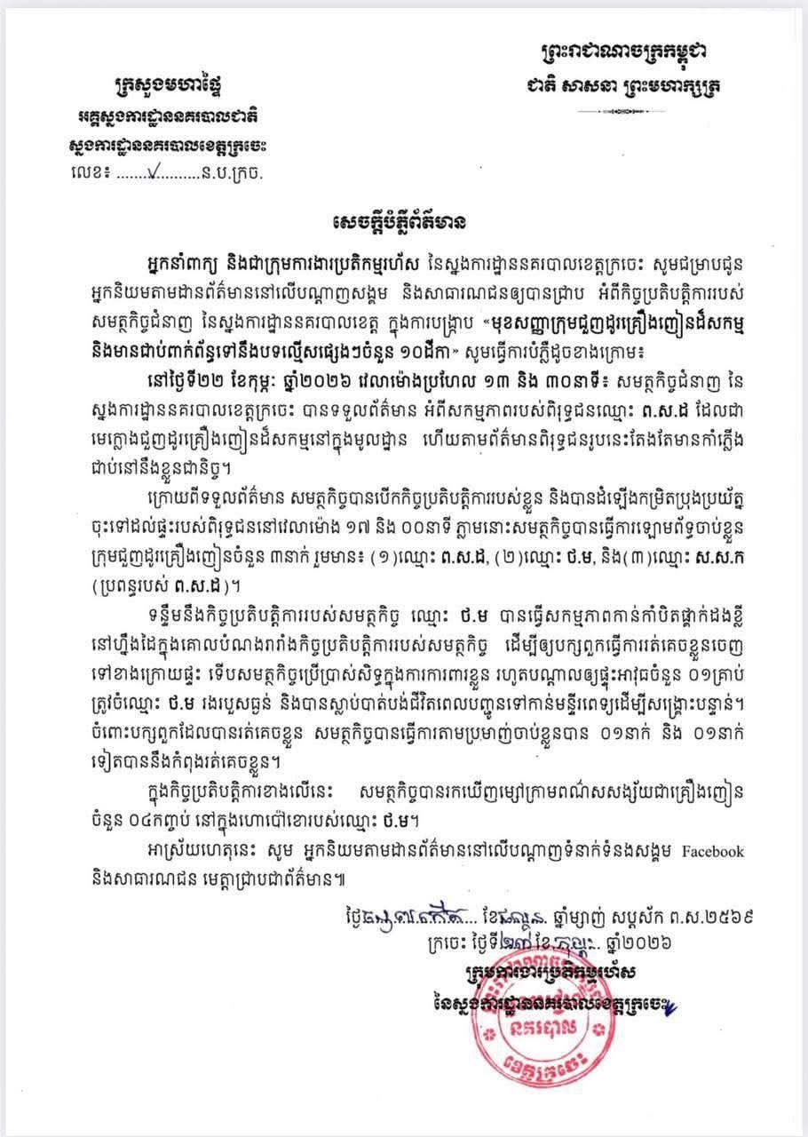 ទោះជាយ៉ាងណាក៏ដោយ នៅរសៀលថ្ងៃដដែល តាមរយៈសេចក្ដីប្រកាសព័ត៌មានរបស់ស្នងការដ្ឋាននគរបាលខេត្តក្រចេះ បានគូសបញ្ជាក់ថា កម្លាំងជំនាញបានបើកប្រតិបត្តិការបង្ក្រាបមុខសញ្ញាក្រុមជួញដូរគ្រឿងញៀនដ៏សកម្ម និងមានជាប់ពាក់ព័ន្ធទៅនឹងបទល្មើសផ្សេងៗចំនួន១០ដីកា។ កំលុងពេលឆ្មក់ក្រសោបបង្ក្រាបឧក្រិដ្ឋជន បុគ្គលឈ្មោះ ថា មករា បានធ្វើសកម្មភាពកាន់កាំបិតផ្គាក់ដងខ្លីនៅហ្នឹងដៃ ក្នុងគោលបំណងរារាំងកិច្ចប្រតិបត្តិការរបស់សមត្ថកិច្ច ដើម្បីឱ្យបក្ខពួកធ្វើការរត់គេចខ្លួន ចេញទៅខាងក្រោយផ្ទះ ទើបសមត្ថកិច្ចប្រើប្រាស់សិទ្ធិការការពារខ្លួន រហូតផ្ទុះអាវុធមួយគ្រាប់ បណ្ដាលឱ្យបាត់បង់ជីវិត ពេលបញ្ចូនទៅកាន់មន្ទីរពេទ្យ ព្រមទាំងរកឃើញម្សៅក្រាមពណ៌-សសង្ស័យជាគ្រឿងញៀនចំនួន០៤កញ្ចប់ នៅក្នុងហោប៉ៅខោជនសង្ស័យ។ ក្នុងប្រតិបត្តិការនេះ សមត្ថកិច្ច បានធ្វើការតាមប្រមាញ់ចាប់ខ្លួនជនសង្ស័យម្នាក់វិញ និងម្នាក់ទៀតបាននិងកំពុងរត់គេចខ្លួន៕