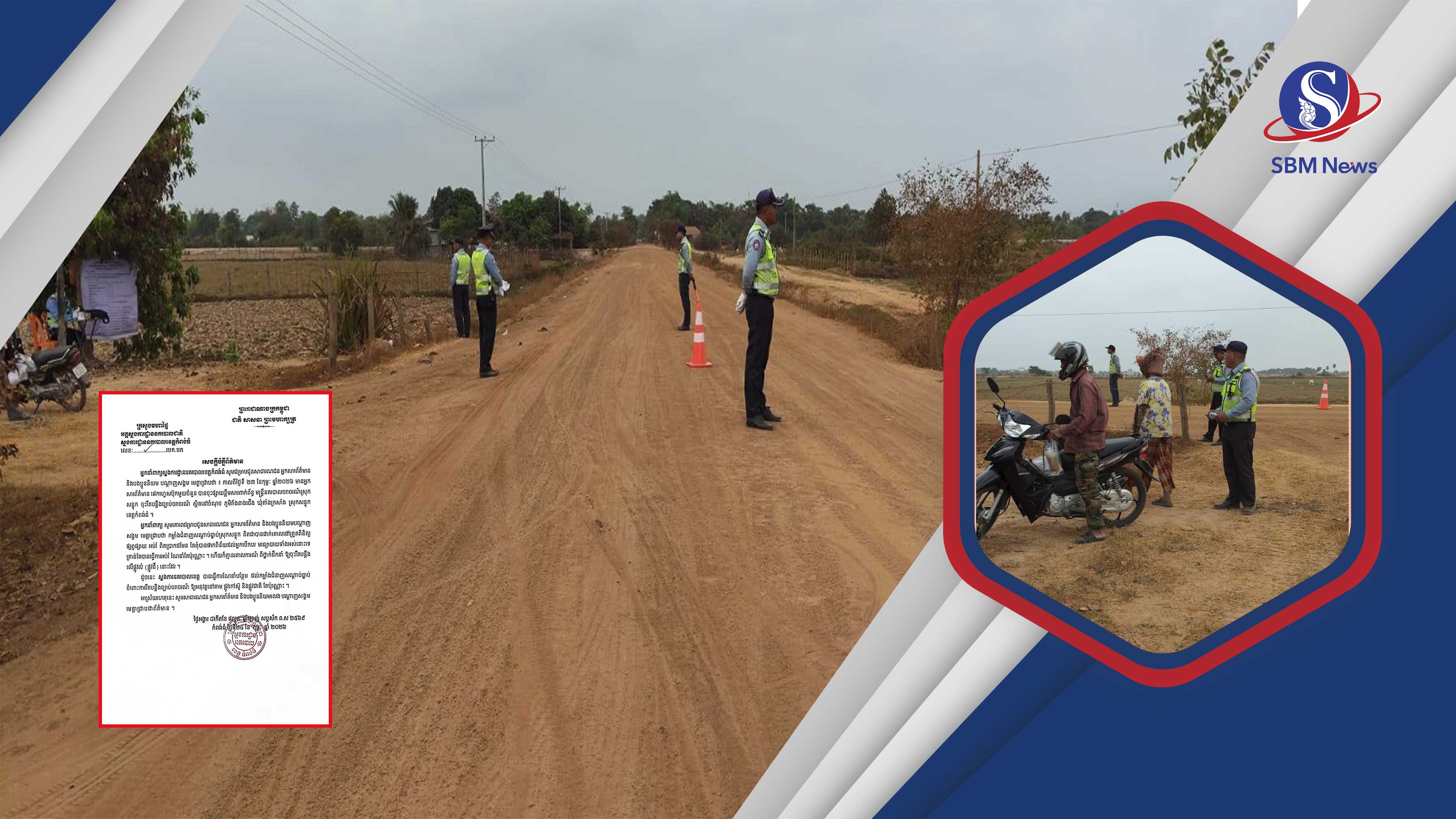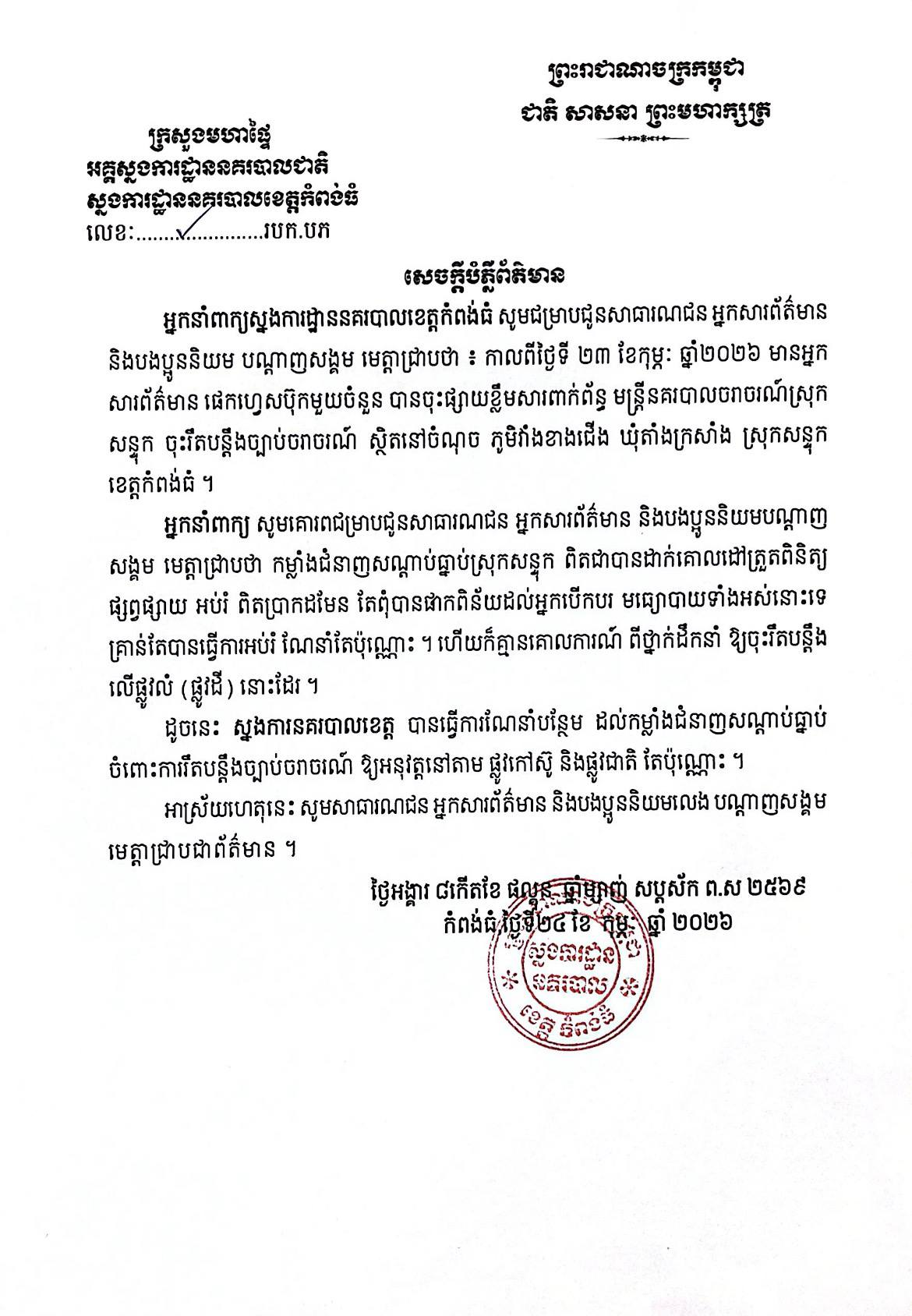 ដោយមើលឃើញសន្ទុះរិះគន់របស់មហាជន កាន់តែច្រើនឡើង ស្នងការដ្ឋាននគរបាលខេត្តកំពង់ធំ នៅព្រឹកថ្ងៃទី២៤ ខែកុម្ភៈ ឆ្នាំ២០២៦នេះ បានចេញសេចក្ដីប្រកាសព័ត៌មានមួយ ដោយគូសបញ្ជាក់ថា កម្លាំងជំនាញសណ្តាប់ធ្នាប់ស្រុកសន្ទុក ពិតជាបានដាក់គោលដៅត្រួតពិនិត្យ ផ្សព្វផ្សាយ អប់រំ ពិតប្រាកដមែន តែពុំបានផាកពិន័យដល់អ្នកបើកបរលើមធ្យោបាយទាំងអស់នោះទេ គ្រាន់តែបានអប់រំណែនាំប៉ុណ្ណោះ។ ជាមួយគ្នា ស្នងការក៏បានបញ្ជាក់ផងដែរថា សកម្មភាពមន្ត្រីនគរបាលចរាចរណ៍ទាំងអស់នោះ ពុំមានគោលការណ៍ពីថ្នាក់ដឹកនាំ ឱ្យចុះរឹតបន្តឹងលើផ្លូវលំ(ផ្លូវដី)ដែរ ដូច្នេះ ស្នងការនគរបាលខេត្តកំពង់ធំ ក៏បានធ្វើការណែនាំបន្ថែមដល់កម្លាំងជំនាញសណ្តាប់ធ្នាប់ ចំពោះការរឹតបន្តឹងច្បាប់ចរាចរណ៍ទាំងអស់ ឱ្យអនុវត្តនៅតាមផ្លូវកៅស៊ូ និងផ្លូវជាតិតែប៉ុណ្ណោះ៕(Sic!)