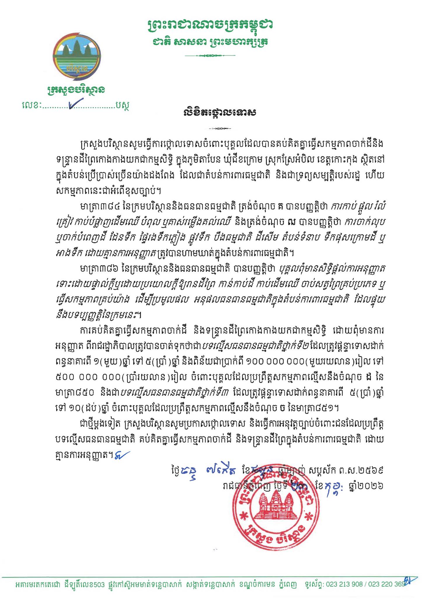 មន្រ្តីបរិស្ថាន បានឱ្យដឹងនៅថ្ងៃទី២៤កុម្ភៈនេះថា ការរួមគ្នាធ្វើសកម្មភាពចាក់ដី និងទន្ទ្រានដីព្រៃកោងកាង គ្មានការអនុញ្ញាតពីរាជរដ្ឋាភិបាល គឺជាបទល្មើសធនធានធម្មជាតិថ្នាក់ទី២ ដែលត្រូវផ្តន្ទាទោសដាក់ពន្ធនាគារពី១ទៅ៥ឆ្នាំ និងពិន័យជាប្រាក់ពីមួយរយលានរៀលទៅប្រាំរយលានរៀល។ មន្រ្តីបរិស្ថានបន្ថែមថា បើតាមមាត្រា៣៨៤ នៃក្រមបរិស្ថាន និងធនធានធម្មជាតិ ត្រង់ចំណុច (គ) បានចែងថា ការកាប់ ផ្តួល រំលំ គៀវ កាប់បំផ្លាញដើមឈើ បំពុល ឬគាស់រម្លើងគល់ឈើ និងត្រង់ចំណុច ឍ បានចែងដែរថា ការចាក់លុប ឬចាក់បំពេញដី ដែនទឹក ផ្ទៃរងទឹកភ្លៀង ផ្លូវទឹក បឹងធម្មជាតិ ដីសើម តំបន់ទំនាប ទឹកផុសក្រោមដី ឬអាងទឹក ដោយគ្មានការអនុញ្ញាត ត្រូវបានហាមឃាត់ក្នុងតំបន់ការពារធម្មជាតិ។