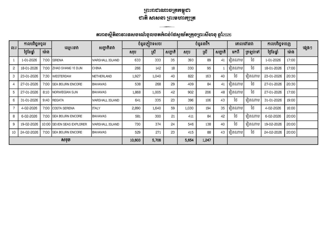 របាយការណ៍បានឱ្យដឹងថា គិតចាប់ពីថ្ងៃទី១ ខែមករា ដល់ថ្ងៃទី២៤កុម្ភៈ ឆ្នាំ២០២៦ ភ្ញៀវចម្រុះជាតិសាសន៍ចំនួន១០៦០៣នាក់ បានមកកម្សាន្តនៅកម្ពុជាតាមនាវាទេសចរណ៍ខ្នាតយក្សចំនួន៨គ្រឿង។ ក្នុងចំណោមនាវាទេសចរណ៍ទាំង៨ នាវា SEABOURN ENCORE សញ្ជាតិ BAHAMAS បានដឹកភ្ញៀវមកកម្ពុជាច្រើនដងជាងគេ ពោលគឺដល់ទៅ៣លើក ដែលលើកទី១ នៅថ្ងៃទី២៧មករា ផ្ទុកភ្ញៀវ៥៣៨នាក់, លើកទី២នៅថ្ងៃទី៦កុម្ភៈ ផ្ទុកភ្ញៀវ៥៨១នាក់ និងលើកទី៣ គឺនៅថ្ងៃទី២៤កុម្ភៈនេះ ផ្ទុកភ្ញៀវ៥២៩នាក់។ សរុបទាំង៣លើក ដើមឆ្នាំ២០២៦នេះ នាវា SEABOURN ENCORE បានដឹកភ្ញៀវមកកាន់កម្ពុជា ចំនួន១៦៤៨នាក់ ដោយមិនរាប់បញ្ចូលចំនួននាវិកនៅលើនាវាទេ។