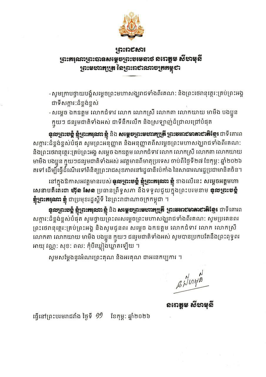 រាជធានីភ្នំពេញ៖ ព្រះករុណា ព្រះបាទសម្ដេច ព្រះបរមនាថ នរោត្ដម សីហមុនី ព្រះមហាក្សត្រនៃព្រះរាជាណាចក្រកម្ពុជា និងសម្តេចព្រះមហាក្សត្រី នរោត្ដម មុនិនាថ សីហនុ ព្រះវររាជមាតាជាតិខ្មែរ ស្តេចទាំងទ្វេនឹងយាងពីប្រទេសកម្ពុជា ចាប់ពីថ្ងៃទី២៧កុម្ភៈ ឆ្នាំ២០២៦ ឆ្ពោះទៅកាន់រដ្ឋធានីប៉េកាំង សាធារណរដ្ឋប្រជាមានិតចិន ដើម្បីពិនិត្យព្រះរាជសុខភាព…។