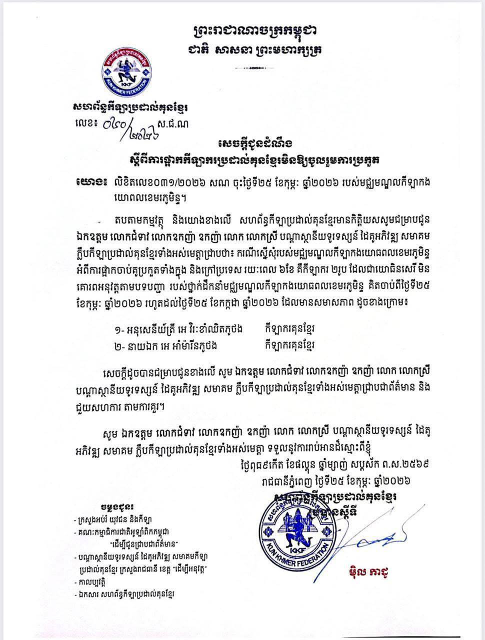 រាជធានីភ្នំពេញ៖ សម្ដេចតេជោ ហ៊ុន សែន ប្រធានព្រឹទ្ធសភានៃកម្ពុជា នៅព្រឹកថ្ងៃទី២៧កុម្ភៈ ឆ្នាំ២០២៦នេះ បានស្នើឱ្យសហព័ន្ធកីឡាប្រដាល់គុនខ្មែរ លុបចោលការដាក់ពិន័យ ចំពោះការផ្អាកនៃការប្រកួតលើកីឡាករប្រដាល់គុនខ្មែរ២រូប ដែលជាកូនប្រុសរបស់អតីតអធិរាជកែងឆេះជង្គង់ទិព្វ អេ ភូថង…។