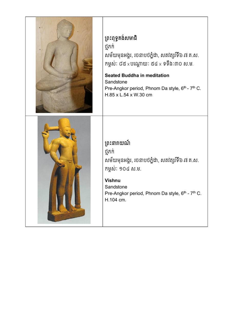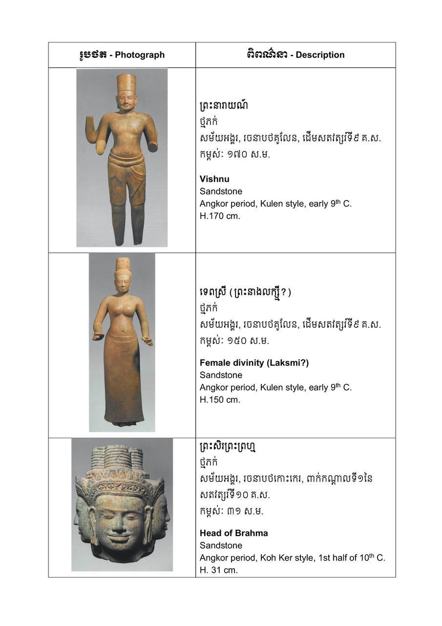តាមក្រសួងវប្បធម៌ វត្ថុបុរាណដែលបញ្ជូនត្រឡប់នាពេលនេះ សុទ្ធតែជាវត្ថុសិល្បៈមានអាយុកាលតាំងពីសម័យមុនអង្គរ រហូតដល់សម័យរុងរឿងនៃចក្រភពអង្គរ មានជាអាទិ៍ បដិមាដ៏ល្អឯកសាងពីថ្មភក់ និងលោហធាតុ ព្រមទាំងវត្ថុប្រើប្រាស់ ក្នុងកិច្ចពិធីផ្សេងៗ។ ក្នុងចំណោមវត្ថុសំខាន់ៗទាំង៧៤រូប ក្រសួងពណ៌នាថា មានបដិមាដ៏ពិចិត្រចំនួន២ សាងពីថ្មភក់នាដើមសម័យអង្គរ ស្ថិតក្នុងរវាង៥០ឆ្នាំដំបូងនៃសតវត្សរ៍ទី៩ ក្នុងរាជព្រះបាទជ័យវរ្ម័នទី២ ដែល លោក ឡាចហ្វដ អះអាងថា មានប្រភពដើមមកពីភ្នំគូលែន។ បដិមាទេពប្រុស និងទេពស្រីនេះ ត្រូវបានចាត់ទុកជាស្នាដៃសិល្បៈគំរូមួយ ដែលត្រូវបានសាងក្នុងដំណាក់កាលដំបូងនៃការបង្កើតចក្រភពអង្គរ ហើយជាញឹកញាប់ត្រូវបានគេហៅថា «បដិមាមួយគូ»។ ជាមួយគ្នា ផ្អែកតាមភស្តុតាងនានា បញ្ជាក់ថា បដិមាទេពស្រីជាវត្ថុបុរាណដ៏កម្រមួយនៃរចនាបថគូលែន។