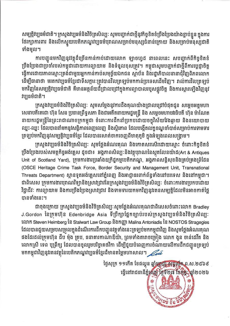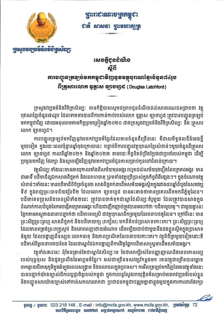 រាជធានីភ្នំពេញ៖ ក្រោយឃ្លាតចាកឆ្ងាយពីទឹកដីកំណើតជាច្រើនសតវត្សរ៍ ទីបំផុតវត្ថុបុរាណខ្មែរចំនួន៧៤រូប បានវិលត្រឡប់មកដែលដីកម្ពុជាវិញហើយ។ ក្រសួងវប្បធម៌ និងវិចិត្រសិល្បៈ ប្រកាសនៅថ្ងៃទី២៧កុម្ភៈ ឆ្នាំ២០២៦ នេះថា អនុលោមតាមកិច្ចព្រមព្រៀងឆ្នាំ២០២០ គ្រួសារលោក ឌូគ្លាស ឡាចហ្វដ (Douglas Latchford) នៅឯប្រទេសអង់គ្លេស បានបញ្ជូនត្រឡប់វត្ថុបុរាណដ៏ច្រើននេះ មកកម្ពុជាវិញ...។