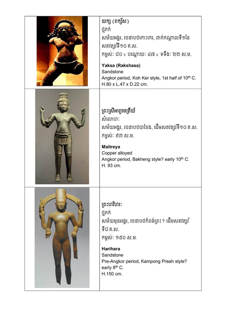 ក្រៅតែពី «បដិមាមួយគូ» នេះ ក្រសួងបញ្ជាក់ថា មានព្រះសិរ្សព្រះព្រហ្ម សាងពីថ្មភក់ និងបដិមាយក្ស (រាក្ស័ស) មកពីតំបន់ប្រាសាទកោះកេរ។ ព្រះសិរ្សព្រះព្រហ្ម ដែលមានទម្រង់ព្រះភក្ត្រស្ងប់ និងពោរពេញដោយអំណាច ដើមឡើយជាប់ជាមួយនឹងដងខ្លួនស្ថិតក្នុងប្រាសាទធំមួយ ដែលបង្ហាញពីទស្សនៈលោកធាតុ និងភាពប្រណិតនៃរចនាបថកោះកេរ។ ក្នុងចំណោមវត្ថុបុរាណដដែលនេះ ក៏មានវត្ថុពិចិត្រមួយទៀត គឺបដិមាសំរិទ្ធរចនាបថបាខែង ដែលជាស្នាដៃឯកបង្ហាញពីការវិវត្តផ្នែកបដិមាសាស្ត្រនា ដើមសម័យអង្គរ។