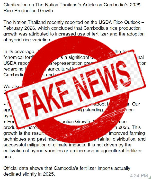 លោក ឃឹម ហ្វីណង់ ចាត់ទុកការចុះផ្សាយរបស់កាសែតថៃនេះ៖«មានចេតនាបង្កឱ្យមានការយល់ឃើញជាអវិជ្ជមានមកលើការប្រើប្រាស់ធាតុចូលក្នុងវិស័យកសិកម្ម ព្រមទាំងអាចប៉ះពាល់ដល់ប្រជាកសិករ និងទីផ្សារកសិផលរបស់កម្ពុជា»។ អ្នកនាំពាក្យក្រសួងកសិកម្ម បំភ្លឺថា ផ្ទុយមកវិញ ទិន្នន័យផ្លូវការបានបង្ហាញថា ការនាំចូលជីកសិកម្មរបស់កម្ពុជា នៅក្នុងឆ្នាំ២០២៥ មានការធ្លាក់ចុះ។ ម៉្យាងវិញទៀត កម្ពុជាក៏មិនមានការអនុវត្តដាំដុះប្រភេទពូជស្រូវ Hybrid នោះដែរ។ ការអភិវឌ្ឍវិស័យកសិកម្មរបស់យើង គឺពឹងផ្អែកលើប្រភេទពូជស្រូវធម្មតា (Non-hybrid varieties) ដែលត្រូវបានកែលម្អ និងមានការប្រើប្រាស់ជាយូរមកហើយ។ ចំពោះផលិតកម្មស្រូវរបស់កម្ពុជា កើនឡើងប្រមាណ១លានតោន ក្នុងឆ្នាំ២០២៥ គឺកើតចេញពីការពង្រីកផ្ទៃដីដាំដុះ ភាពប្រសើរឡើងនៃបច្ចេកទេសដាំដុះ និងការគ្រប់គ្រងសមាសភាពចង្រៃ ភាពអំណោយផលល្អនៃរបាយទឹកភ្លៀង និងការកាត់បន្ថយផលប៉ះពាល់ដែលបណ្ដាលមកពីកត្តាអាកាសធាតុ ជាជាងមកពីការដាំដុះប្រភេទពូជ Hybrid ឬការកើនឡើងនៃការប្រើប្រាស់ជីកសិកម្ម៕