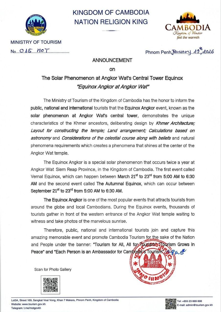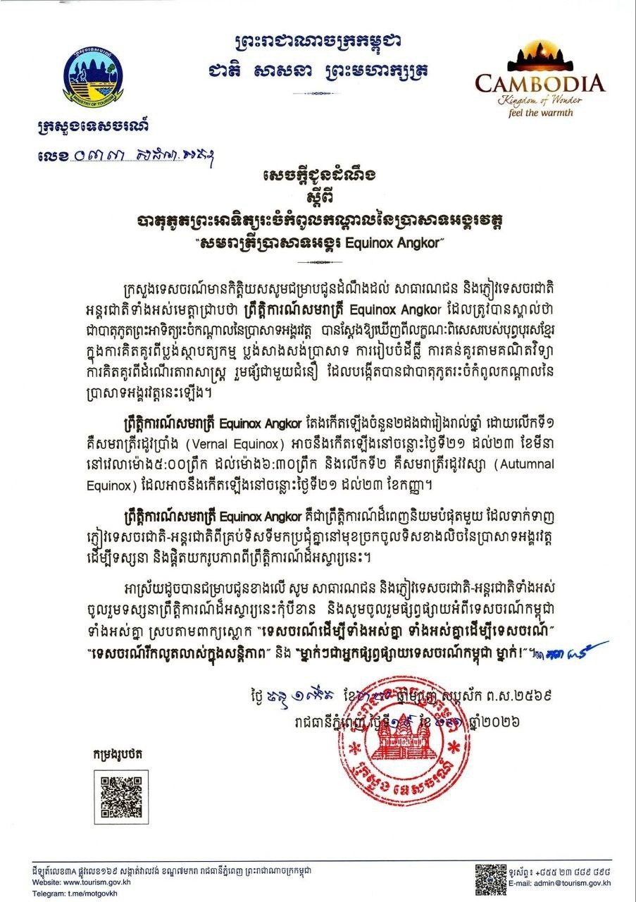 តាមរយៈសេចក្តីជូនដំណឹងកាលពីថ្ងៃទី២៧ ខែកុម្ភៈ ក្រសួងទេសចរណ៍បញ្ជាក់ថា សមរាត្រីរដូវប្រាំង (Vernal Equinox) នឹងកើតឡើងនៅចន្លោះថ្ងៃទី២១ ដល់២៣ខែមីនា ចាប់ពីវេលាម៉ោង៥ដល់ម៉ោង៦:៣០ព្រឹក។ ក្រសួង អំពាវនាវដល់សាធារណជន និងភ្ញៀវទេសចរជាតិ-អន្តរជាតិ ចូលរួមទស្សនាព្រឹត្តិការណ៍ដ៏អស្ចារ្យនេះកុំបីខកខាន និងចូលរួមផ្សព្វផ្សាយអំពីទេសចរណ៍កម្ពុជា ស្របតាមពាក្យស្លោក «ទេសចរណ៍ដើម្បីទាំងអស់គ្នា ទាំងអស់គ្នាដើម្បីទេសចរណ៍» «ទេសចរណ៍រីកលូតលាស់ក្នុងសន្តិភាព» និង «ម្នាក់ៗជាអ្នកផ្សព្វផ្សាយទេសចរណ៍កម្ពុជា ម្នាក់!»។ ក្រសួងចាត់ទុក សមរាត្រី គឺជាព្រឹត្តិការណ៍ដ៏ពេញនិយមបំផុតមួយដែលទាក់ទាញ ភ្ញៀវទេសចរជាតិ-អន្តរជាតិពីគ្រប់ទិសទីមកប្រជុំគ្នានៅមុខច្រកចូលទិសខាងលិចនៃប្រាសាទអង្គរវត្ត ដើម្បីទស្សនា និងផ្តិតយករូបភាពពីព្រឹត្តិការណ៍ដ៏អស្ចារ្យនេះ។