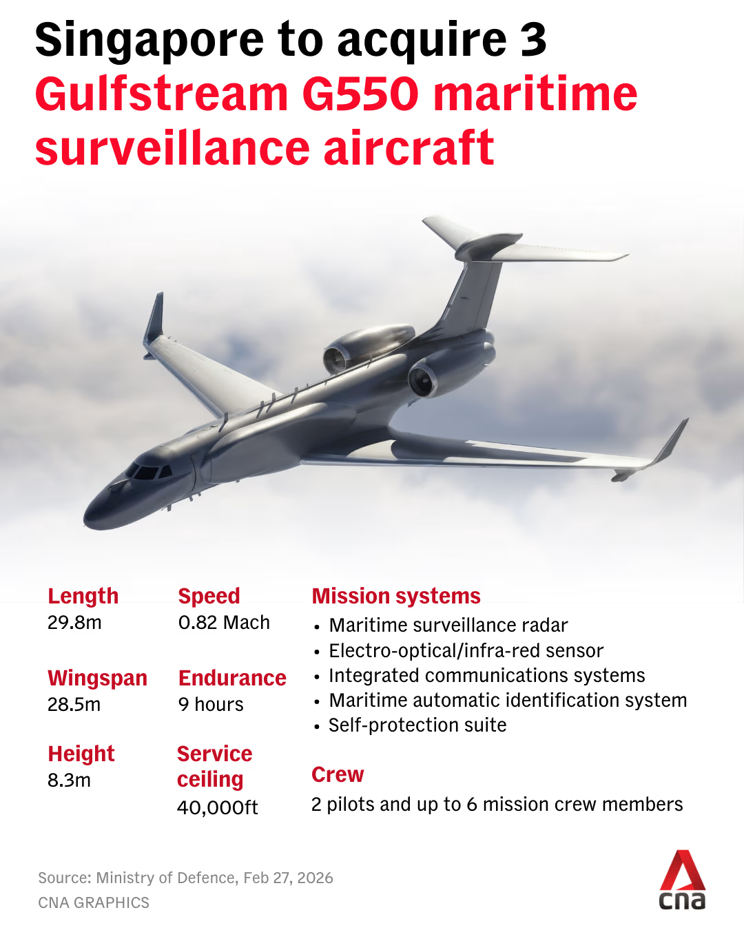 សិង្ហបុរី៖ កងទ័ពអាកាសសិង្ហបុរី (RSAF) សម្រេចបញ្ជាទិញយន្តហោះល្បាតដែនសមុទ្ទប្រភេទ Gulfstream G550 ចំនួន៣គ្រឿង ដើម្បីពង្រឹងសមត្ថភាពផ្ដល់សញ្ញាព្រមានឱ្យបានទាន់ពេលវេលាចំពោះការគំរាមកំហែងតាមដែនសមុទ្ទ។ នេះបើយោងតាមការលើកឡើងរបស់រដ្ឋមន្ត្រីការពារជាតិ លោក ចាន ជុនស៊ីង (Chan Chun Sing) នៅថ្ងៃទី២៧ ខែកុម្ភៈ។