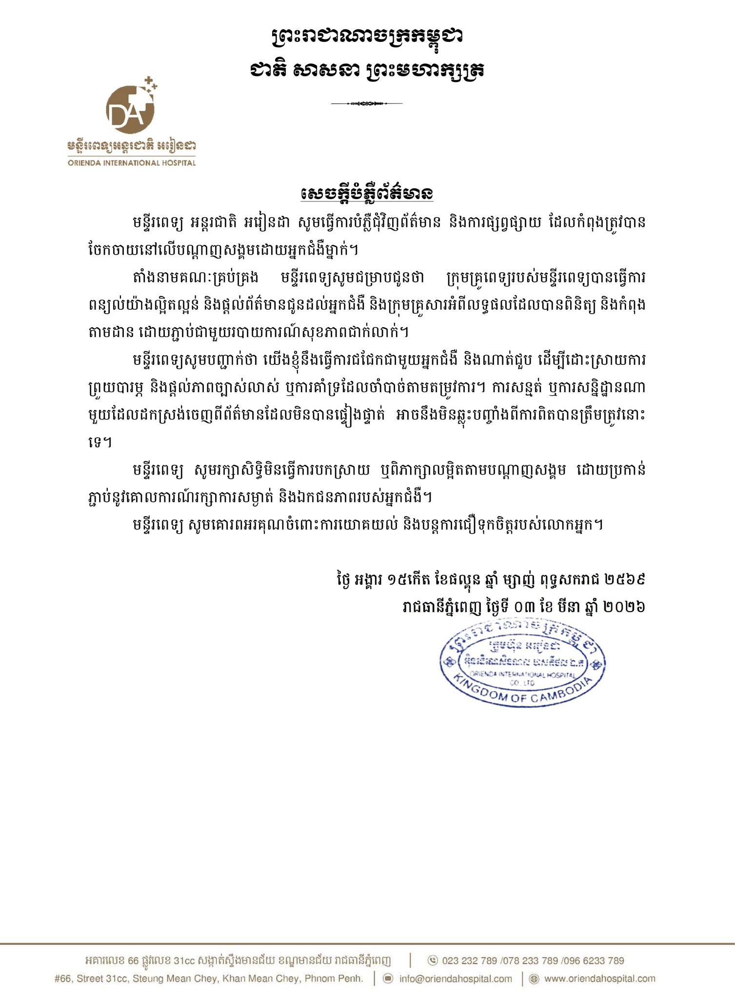 ជាមួយគ្នា អង្គភាពសារព័ត៌មាន SBM News បានព្យាយាមសុំការបំភ្លឺពីលោក ងី មានហេង ប្រធានមន្ទីរសុខាភិបាលរាជធានីភ្នំពេញ តាមប្រព័ន្ធតេលេក្រាម នាព្រឹកថ្ងៃទី០៤ ខែមីនា ឆ្នាំ២០២៦នេះ ដោយលោកបានចូលមើលសំណួររបស់ការីនិពន្ធយើង តែពុំមានការឆ្លើយតបអ្វីឡើយ គិតត្រឹមម៉ោងចេញផ្សាយនេះ៕