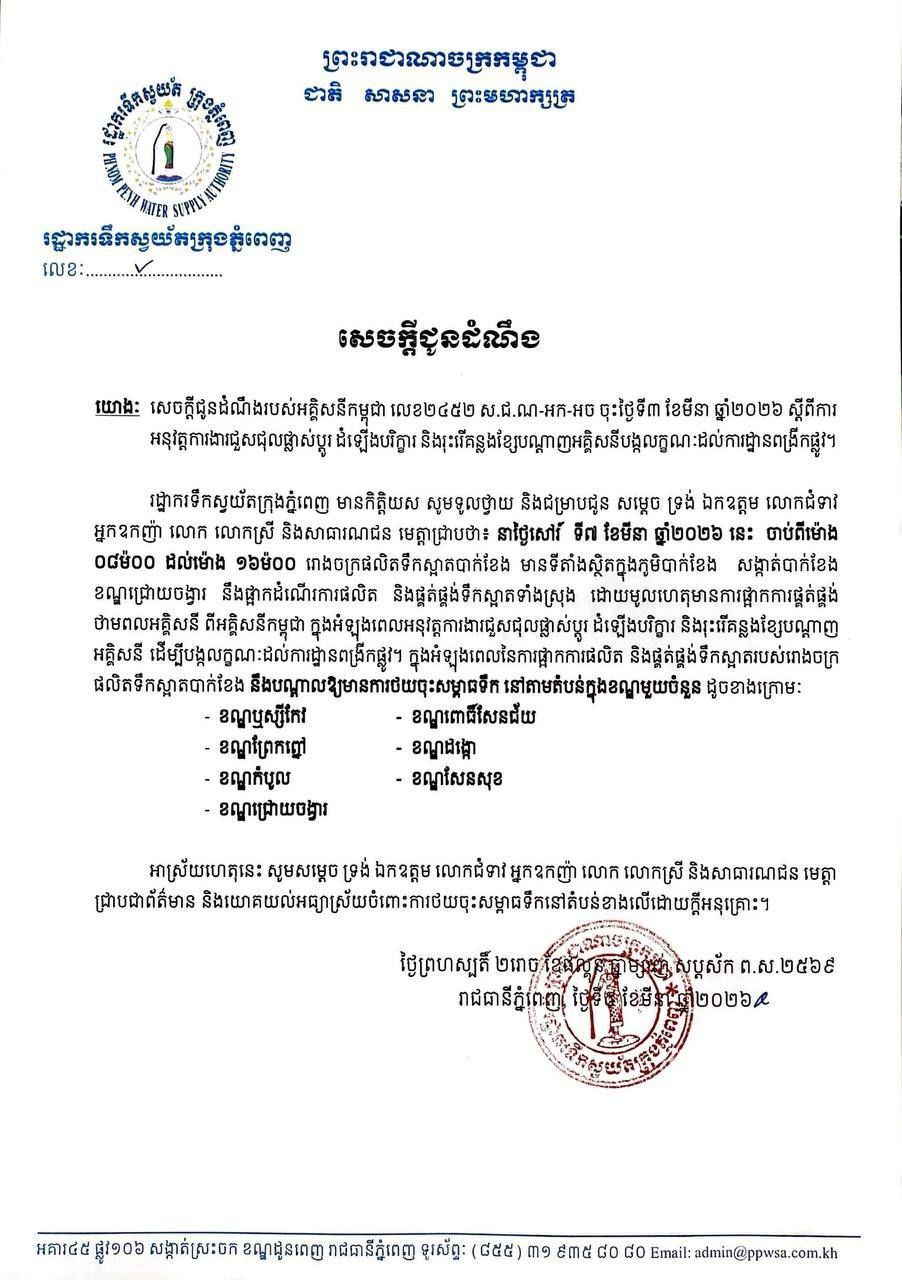 រាជធានីភ្នំពេញ៖ បណ្តាខណ្ឌសរុបចំនួន៧ក្នុងរាជធានីភ្នំពេញ នឹងមានបញ្ហាទឹកខ្សោយចាប់ពីម៉ោង៨ព្រឹករហូតដល់ម៉ោង៤រសៀលថ្ងៃទី៧ ខែមីនា ឆ្នាំ២០២៦ ដោយសាររោងចក្រផលិតទឹកស្អាតបាក់ខែង ស្ថិតនៅខណ្ឌជ្រោយចង្វា ផ្អាកដំណើរការផលិតកម្ម។ នេះបើយោងតាមសេចក្តីជូនដំណឹងរបស់រដ្ឋាករទឹកស្វយ័តក្រុងភ្នំពេញ…។